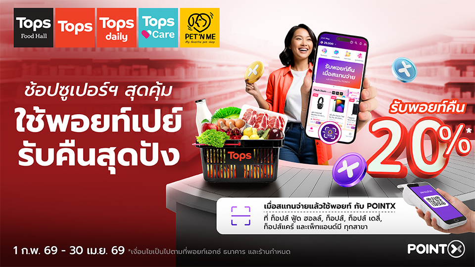 ช้อปซูเปอร์ฯ สุดคุ้ม รับพอยท์คืน 20% ที่ ท็อปส์ ฟู้ด ฮอลล์, ท็อปส์, ท็อปส์ เดลี่, ท็อปส์แคร์ และเพ็ทแอนด์มี
