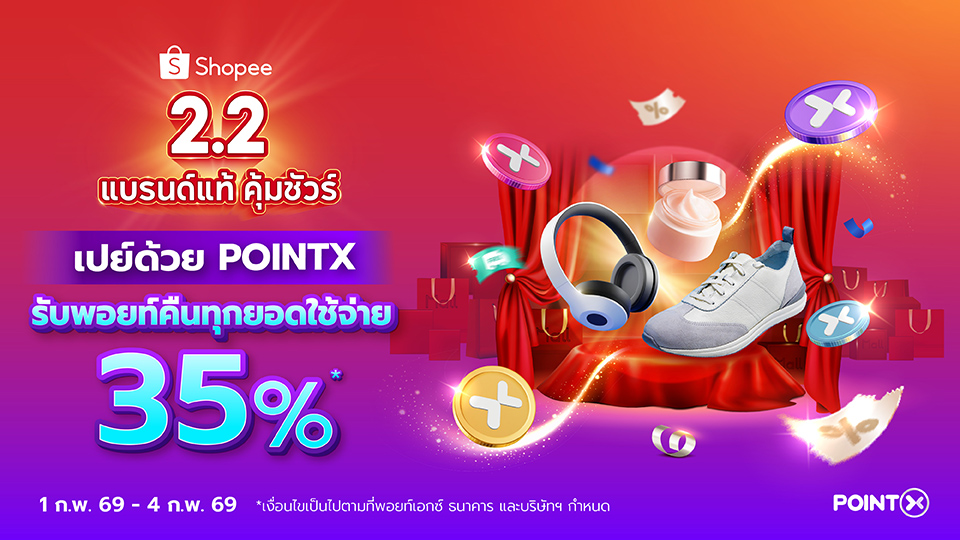 Shopee 2.2 จ่ายด้วยคะแนน POINTX รับพอยท์คืน 35% ทุกยอดใช้จ่าย