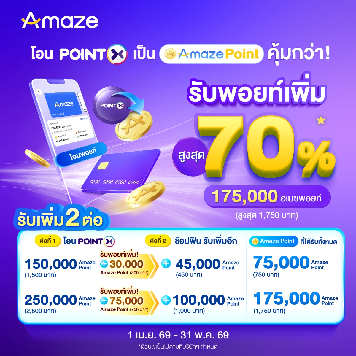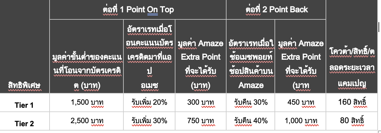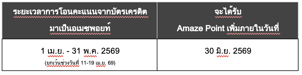 - ผู้เข้าร่วมสามารถรับ Amaze Point มูลค่าสูงสุด 1,750 บาทเมื่อโอนพอยต์ตามจำนวนขั้นต่ำที่กำหนดในตารางด้านล่าง