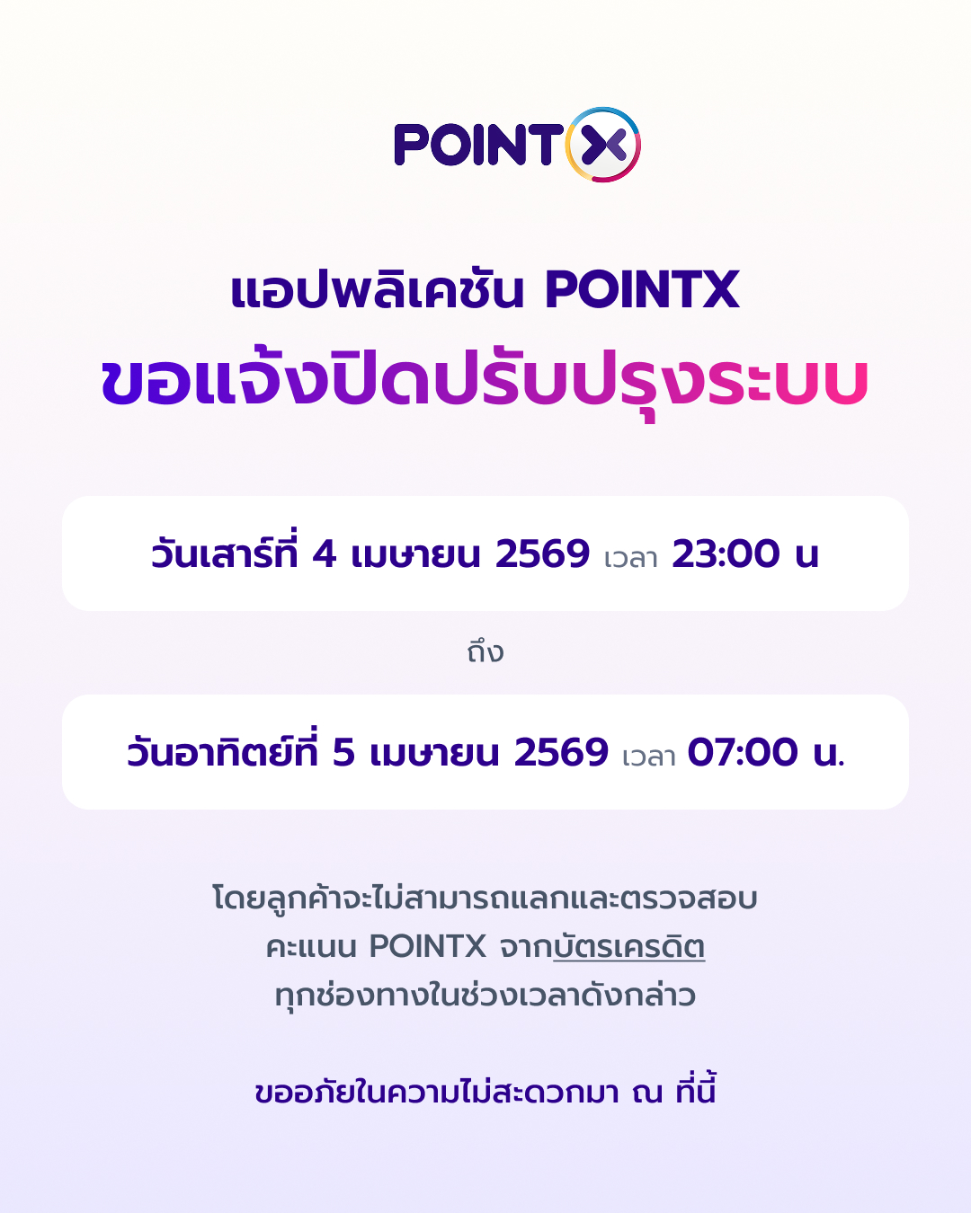 แอปพลิเคชัน POINTX ขอแจ้งปิดปรับปรุงระบบชั่วคราว