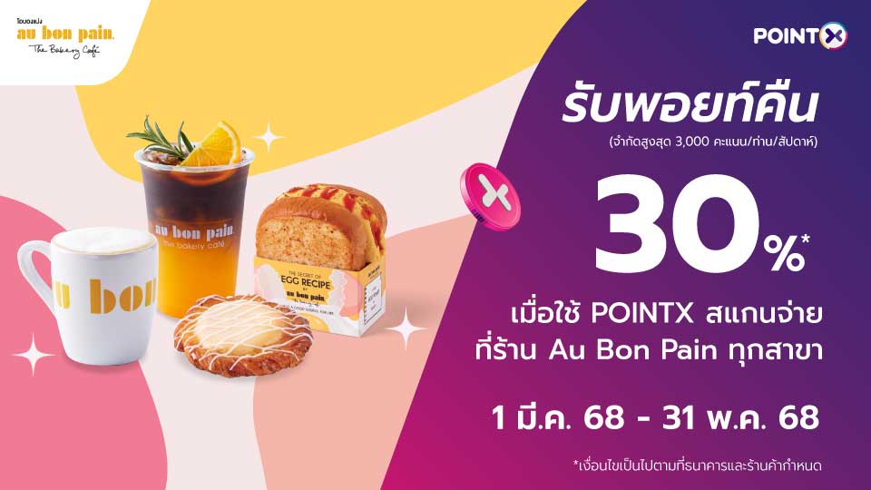 • สิทธิพิเศษนี้สำหรับลูกค้าบริษัท พอยท์เอกซ์ จำกัด (“พอยท์เอกซ์”) ที่เป็นสมาชิก POINTX Application รับพอยท์พิเศษ POINTX คืน 30% เมื่อชำระค่าอาหารหรือเครื่องดื่ม ด้วยคะแนน POINTX ที่ร้านโอ บอง แปง (“ร้านค้า”) ทุกสาขา (ยกเว้นสาขา EMQUARTIER) ผ่านบริการช่องทางชำระเงินด้วย QR พร้อมเพย์ หรือ QR บัตรเครดิต บน SCB Easy Application ตามเงื่อนไขที่กำหนด ตั้งแต่วันที่ 1 มีนาคม 2568 – 31 พฤษภาคม 2568 เท่านั้น