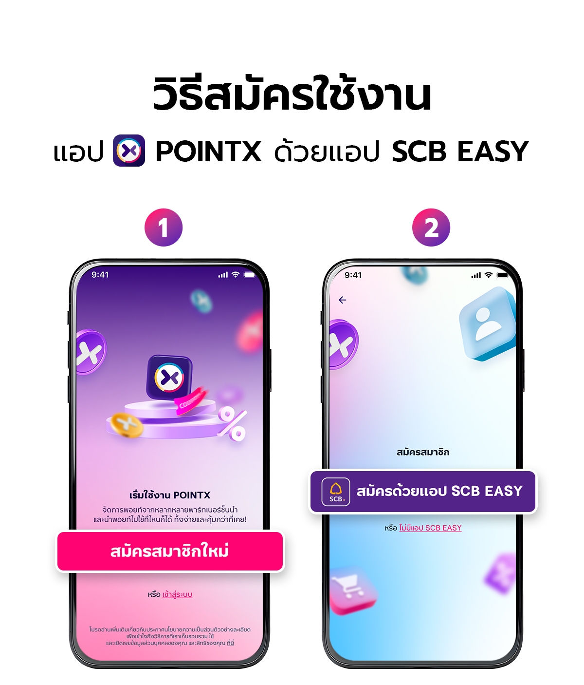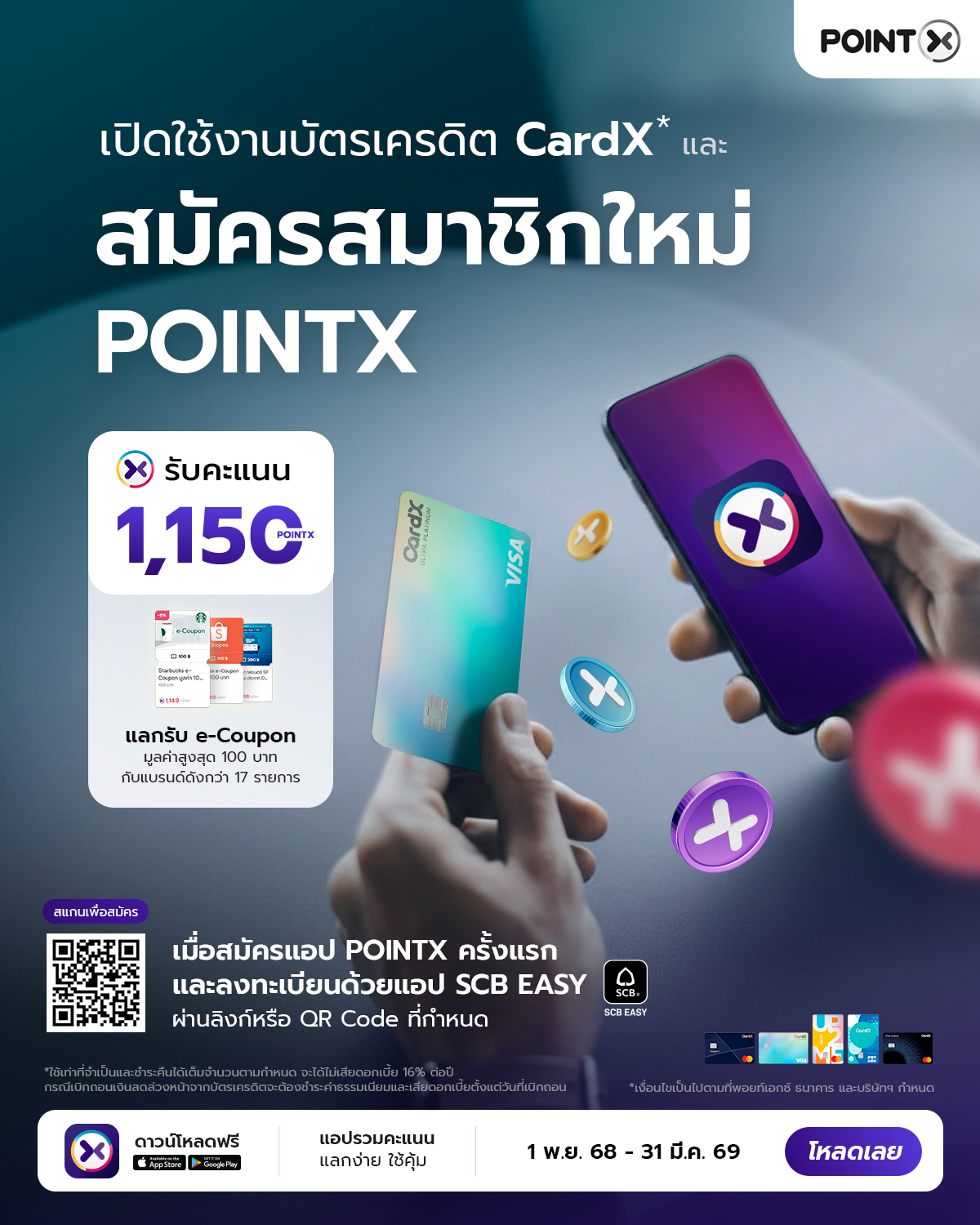 • ลูกค้าจะต้องทำการ เปิดใช้งานบัตรเครดิตคาร์ดเอกซ์ ประเภทใดก็ได้ (ยกเว้นบัตร CardX FAMILY PLUS) และทำการลงทะเบียนใช้งาน POINTX Application เป็นครั้งแรก ผ่าน SCB EASY Application โดยการลงทะเบียนต้องดำเนินการผ่านลิงก์หรือ QR Code ที่กำหนด ระหว่างวันที่ 1 พฤศจิกายน 2568 ถึง 31 มีนาคม 2569