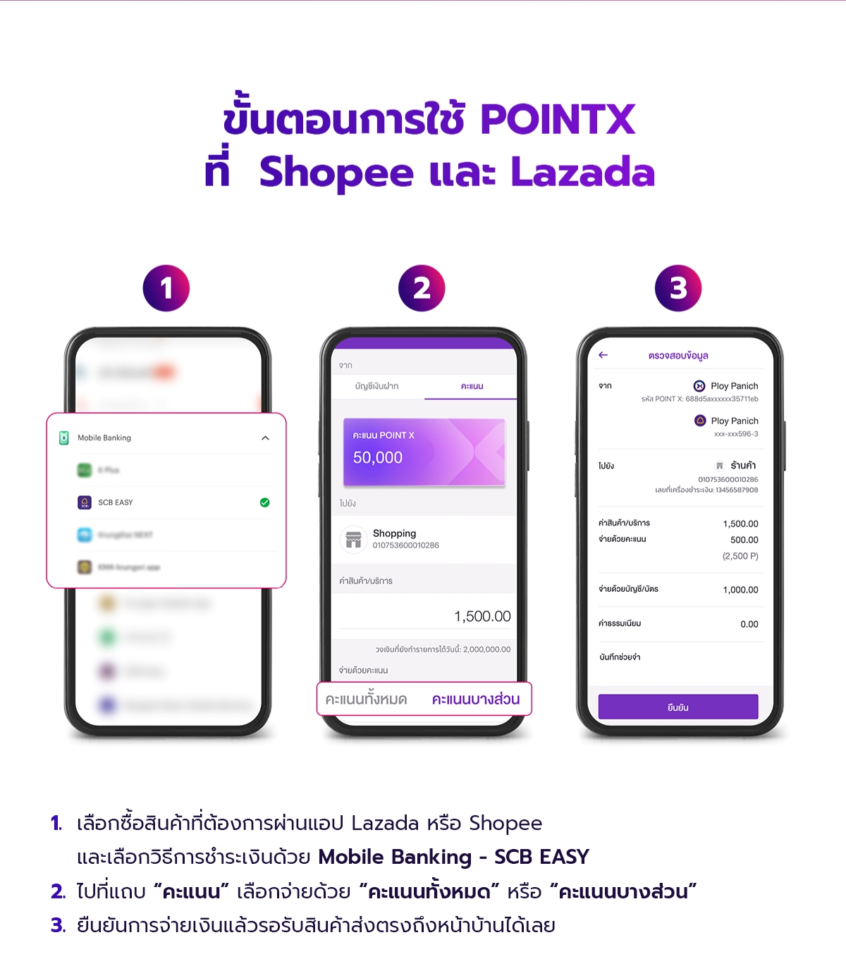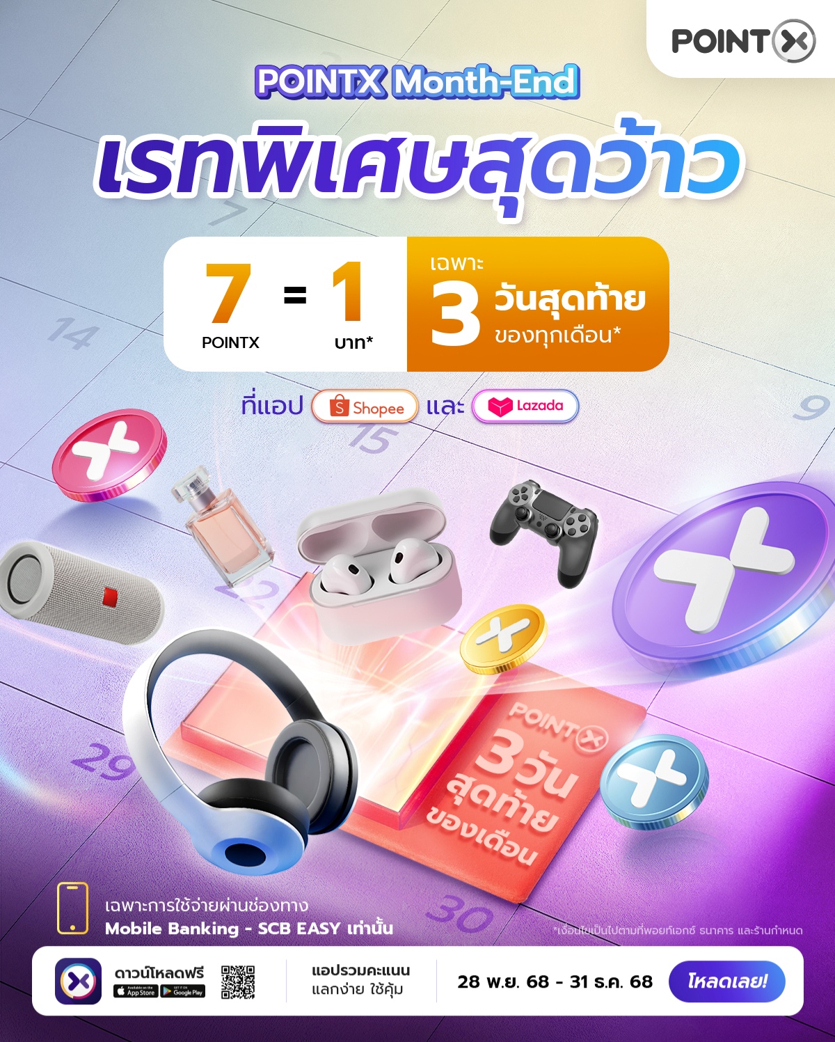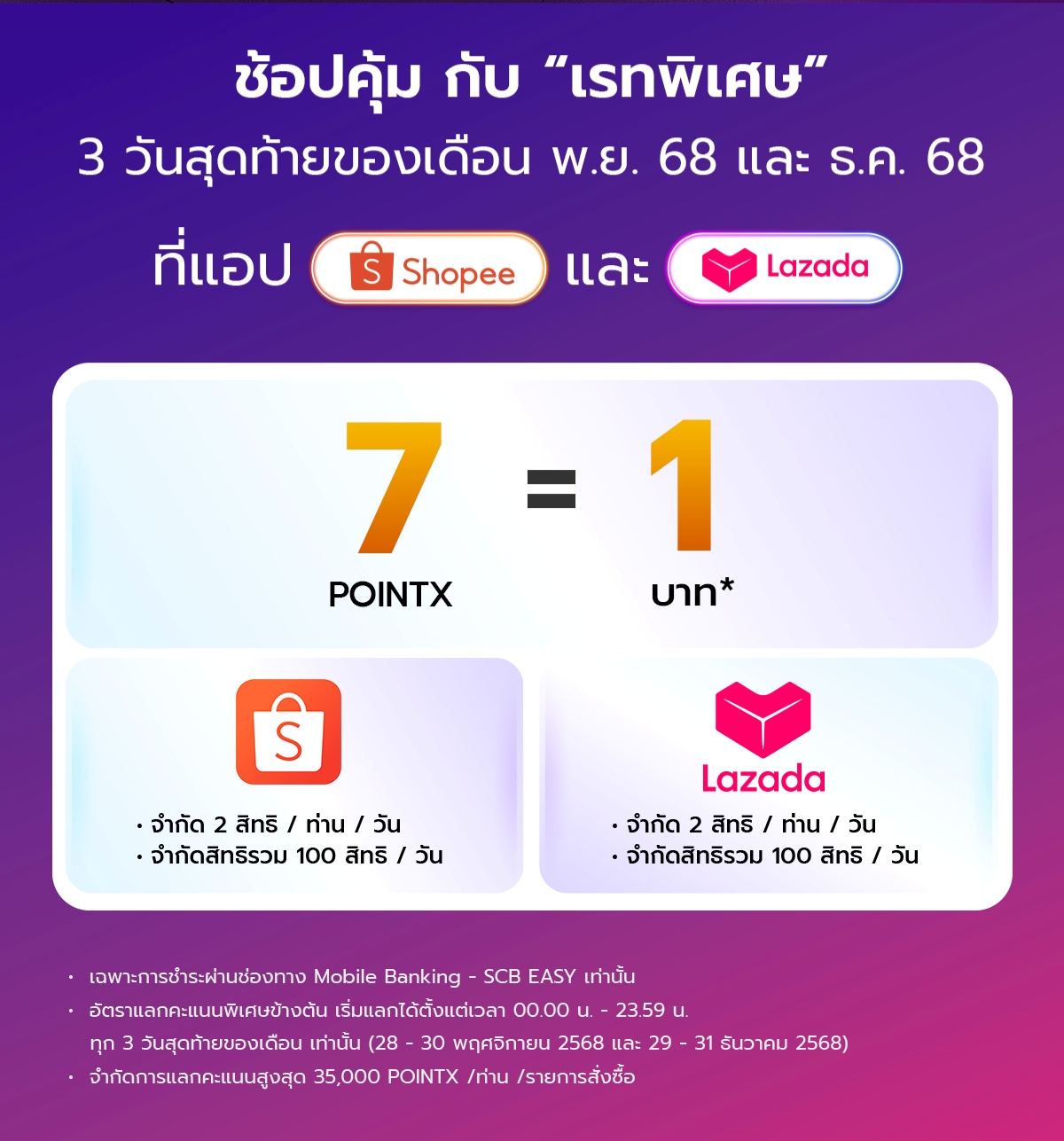 • สิทธิพิเศษนี้สำหรับลูกค้าบริษัท พอยท์เอกซ์ จำกัด (“พอยท์เอกซ์”) ที่ชำระค่าสินค้าหรือบริการที่ Lazada และ Shopee (“ร้านค้า”) ด้วยคะแนน POINTX ผ่านช่องทางการชำระเงิน Mobile Banking บน SCB Easy Application รับอัตราแลกคะแนนพิเศษทุก 3 วันสุดท้ายของทุกเดือน ตามเงื่อนไขที่กำหนด ตั้งแต่วันที่ 28 พฤศจิกายน 2568 – 31 ธันวาคม 2568 เท่านั้น (“ระยะเวลาส่งเสริมการขาย”)