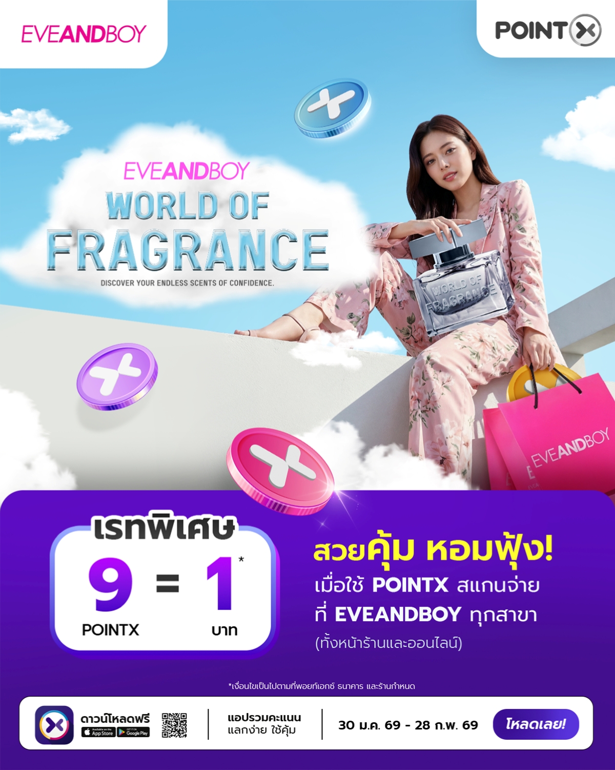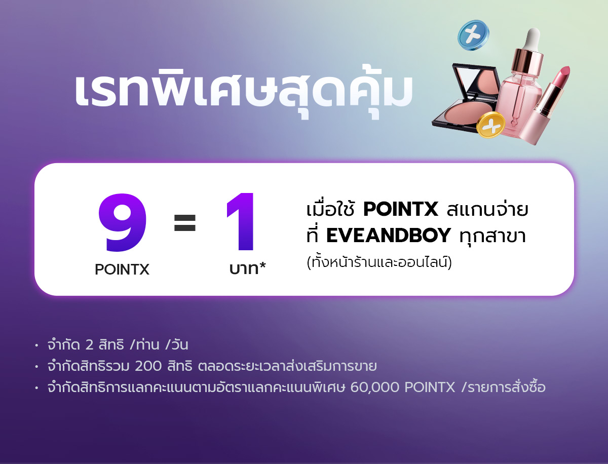 - สิทธิพิเศษนี้สำหรับลูกค้าบริษัท พอยท์เอกซ์ จำกัด (“พอยท์เอกซ์”) ที่เป็นสมาชิก POINTX แอปพลิเคชัน และชำระค่าสินค้าหรือบริการที่ร้าน EVEANDBOY ทุกสาขา และ EVEANDBOY ออนไลน์ (“ร้านค้า”) ด้วยคะแนน POINTX ด้วยช่องทางการชำระเงิน QR พร้อมเพย์ ลูกค้าจะได้รับสิทธิแลกคะแนน POINTX ด้วยอัตราแลกคะแนนพิเศษตามข้อกำหนดและเงื่อนไขของรายการส่งเสริมการขายที่กำหนดไว้นี้ ตั้งแต่วันที่ 30 มกราคม 2569 – 28 กุมภาพันธ์ 2569 (“ระยะเวลาส่งเสริมการขาย”) เท่านั้น ทั้งนี้ ไม่รวมช่วงระยะเวลาที่ระบบขัดข้องหรือหยุดให้บริการชั่วคราวเพื่อปิดปรับปรุงระบบ