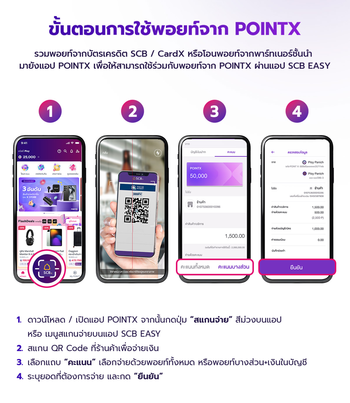 - การแลกคะแนน POINTX เพื่อชำระค่าสินค้าหรือบริการที่ร้านค้าด้วยการสแกนจ่าย QR พร้อมเพย์ ผ่านบริการ SCB Easy Application ลูกค้าต้องมีบัญชีเงินฝากธนาคารไทยพาณิชย์ บน SCB Easy Application เท่านั้น โดยลูกค้าสามารถเลือกชำระด้วยคะแนน POINTX เต็มจำนวน หรือคะแนน POINTX บางส่วนร่วมกับเงินในบัญชีเงินฝากธนาคารไทยพาณิชย์