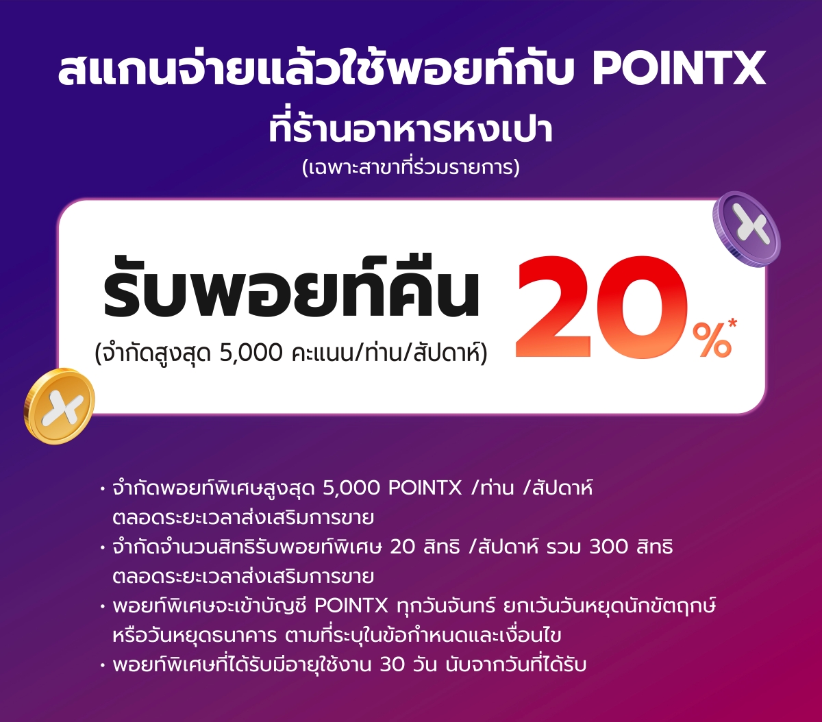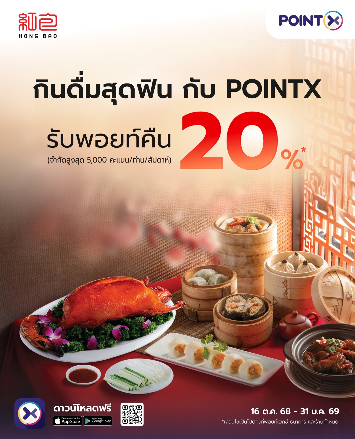 • สิทธิพิเศษนี้สำหรับลูกค้าบริษัท พอยท์เอกซ์ จำกัด (“พอยท์เอกซ์”) ที่เป็นสมาชิก POINTX Application รับพอยท์พิเศษ POINTX 20% (Point Back) เมื่อชำระค่าอาหารและเครื่องดื่ม ด้วยคะแนน POINTX  ที่ร้านอาหารหงเปา เฉพาะสาขาที่ร่วมรายการ รวมทุกรายการใช้จ่ายในแต่ละสัปดาห์ ผ่านบริการช่องทางชำระเงินบน ด้วย QR พร้อมเพย์ บน SCB Easy Application ตามเงื่อนไขที่พอยท์เอกซ์กำหนด ตั้งแต่วันที่ 16 ตุลาคม 2568 – 31 มกราคม 2569 เท่านั้น