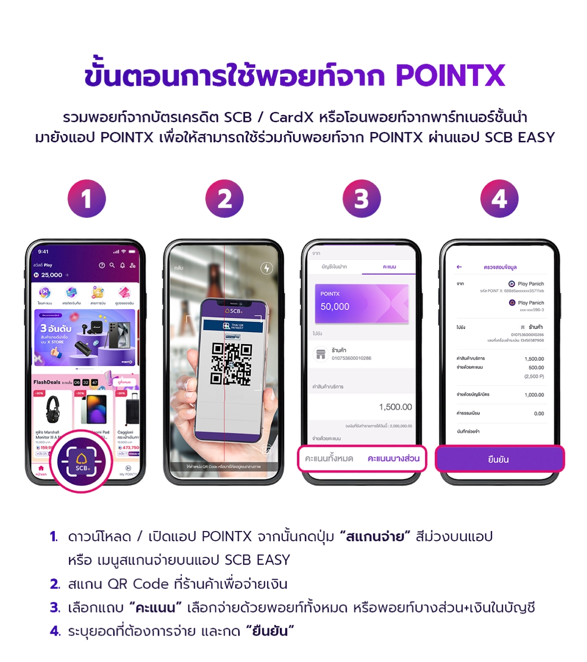 • ท่านสามารถตรวจสอบอัตราแลกคะแนนของร้านค้าได้ในขั้นตอนการชำระด้วย POINTX ผ่าน SCB EASY Application