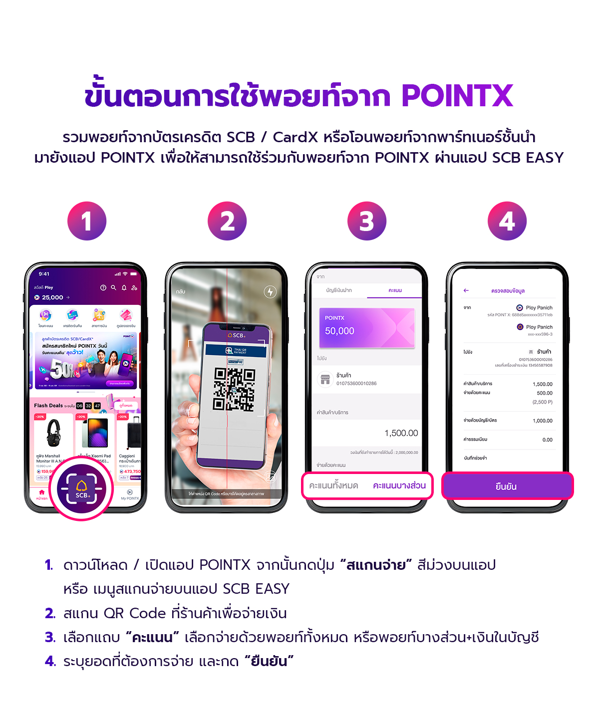 • สามารถตรวจสอบอัตราแลกคะแนนของร้านค้าได้บนหน้าแอปพลิเคชัน POINTX หรือในขั้นตอนการชำระเงินด้วย POINTX ผ่าน SCB Easy Application