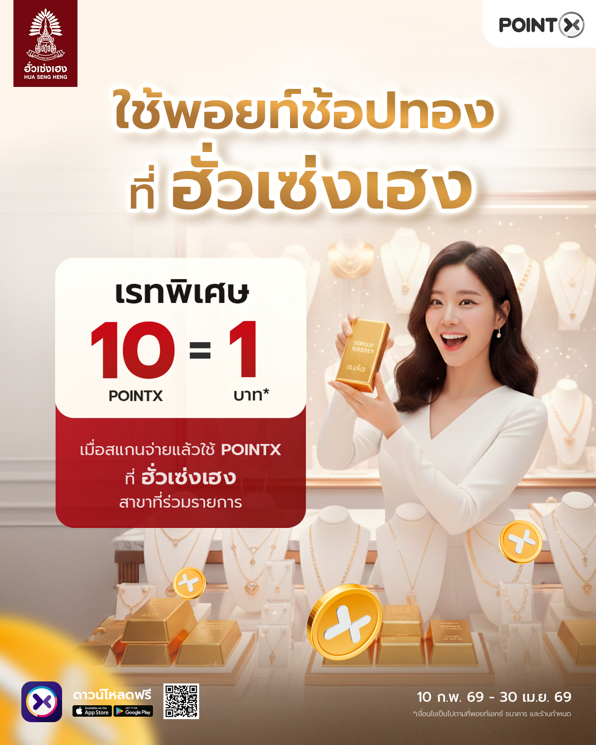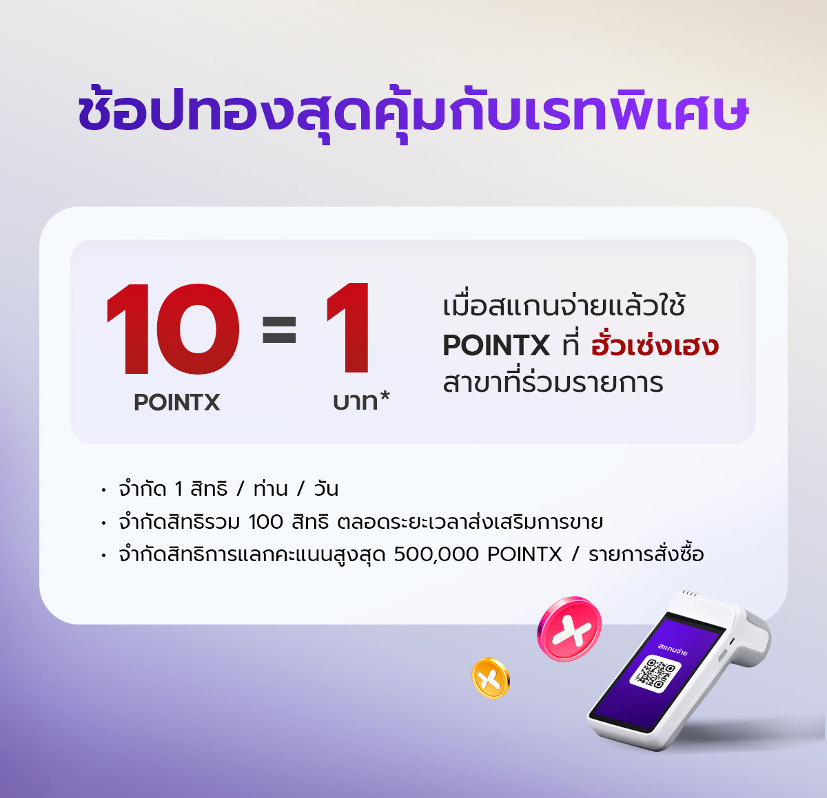 • จำกัดสิทธิการแลกคะแนนด้วยอัตราการแลกคะแนนพิเศษ เฉพาะลูกค้าที่ชำระค้าสินค้าด้วยคะแนน POINTX ผ่าน POINTX แอปพลิเคชัน ที่ ฮั่วเซงเฮง เฉพาะสาขาที่ร่วมรายการ จำนวน 1 สิทธิ ต่อท่าน ต่อวัน จำกัดสิทธิรวม 100 สิทธิ ตลอดระยะเวลาส่งเสริมการขาย และขอสงวนสิทธิให้แก่ลูกค้าที่เข้าเงื่อนไขก่อนตามลำดับ