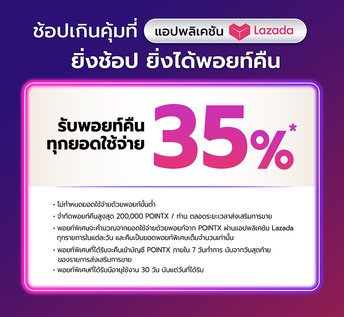 - คะแนนพิเศษจะคำนวณจากยอดใช้จ่ายด้วยคะแนน POINTX ที่แอปพลิเคชัน Lazada ทุกรายการในแต่ละวัน และคืนเป็นยอดเต็มจำนวนเท่านั้น
