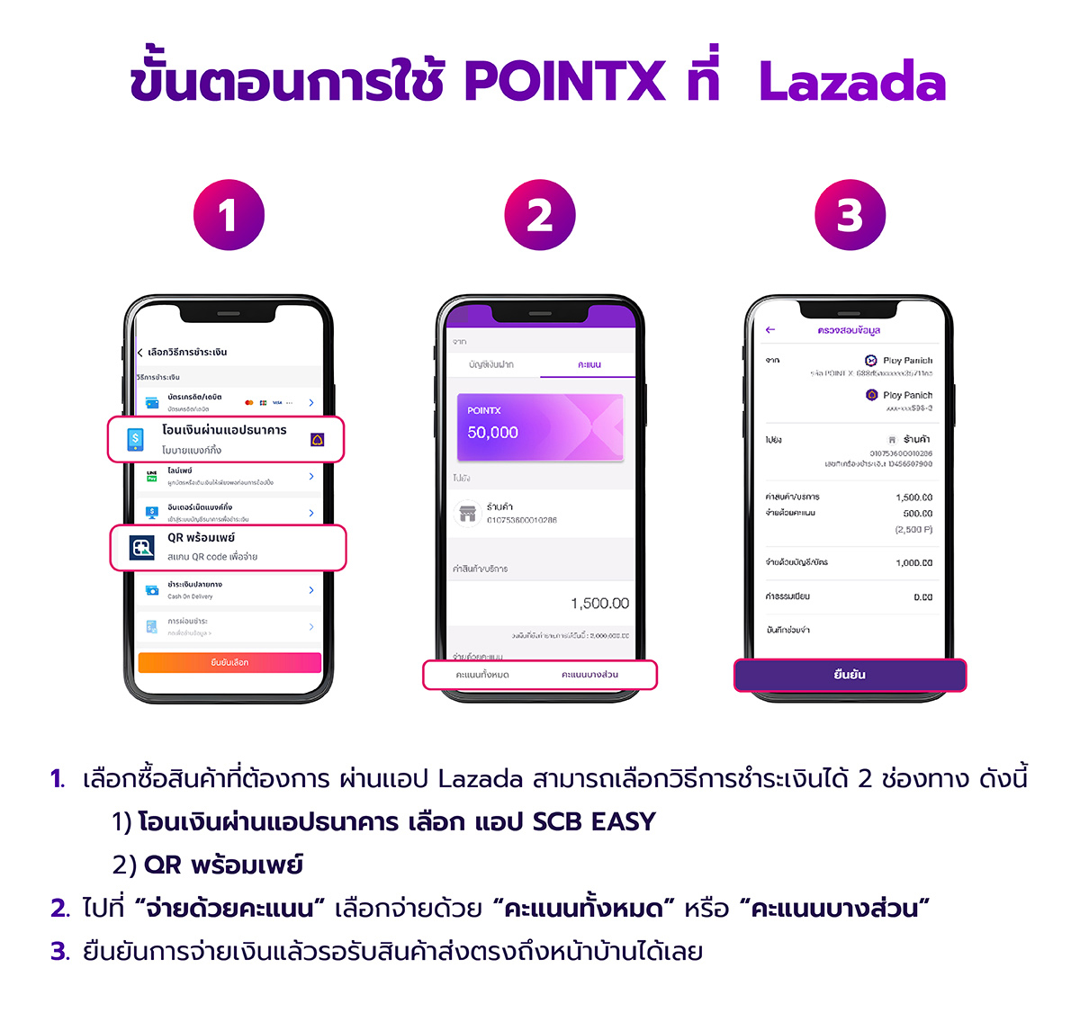 - สิทธิพิเศษนี้สำหรับลูกค้าบริษัท พอยท์เอกซ์ จำกัด (“พอยท์เอกซ์”) ที่ชำระค่าสินค้าหรือบริการ ด้วยคะแนน POINTX ที่ Lazada ผ่านช่องทางการชำระเงินด้วย QR พร้อมเพย์ หรือ Mobile Banking บน SCB Easy Application รับคะแนนพิเศษคืน 35% ทุกยอดใช้จ่ายด้วยคะแนน POINTX ตามเงื่อนไขที่กำหนด ตั้งแต่วันที่ 1 กุมภาพันธ์ 2569 – 4 กุมภาพันธ์ 2569 (“ระยะเวลาส่งเสริมการขาย”) เท่านั้น ทั้งนี้ ไม่รวมช่วงระยะเวลาที่ระบบขัดข้องหรือหยุดให้บริการชั่วคราวเพื่อปิดปรับปรุงระบบ