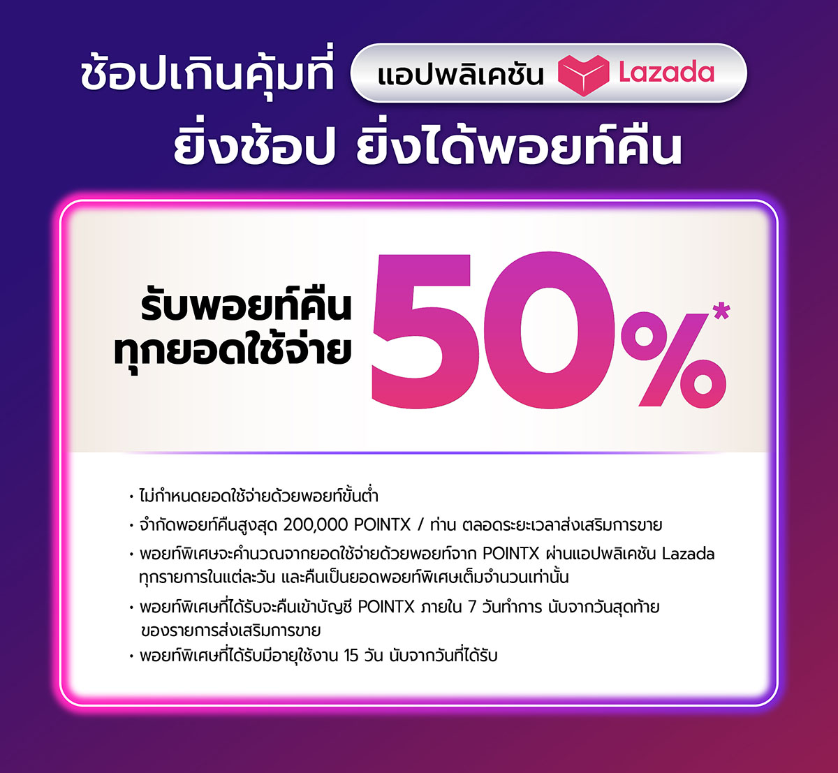 - รับคะแนนพิเศษคืน 50% เมื่อลูกค้าชำระค่าสินค้าหรือบริการ ด้วย POINTX บนแอปพลิเคชัน Lazada
