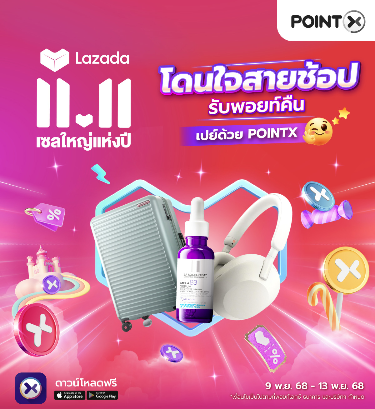 - วันที่ 11 พฤศจิกายน 2568 ทุกยอดใช้จ่ายด้วยคะแนน POINTX รับคะแนนพิเศษคืน 50%