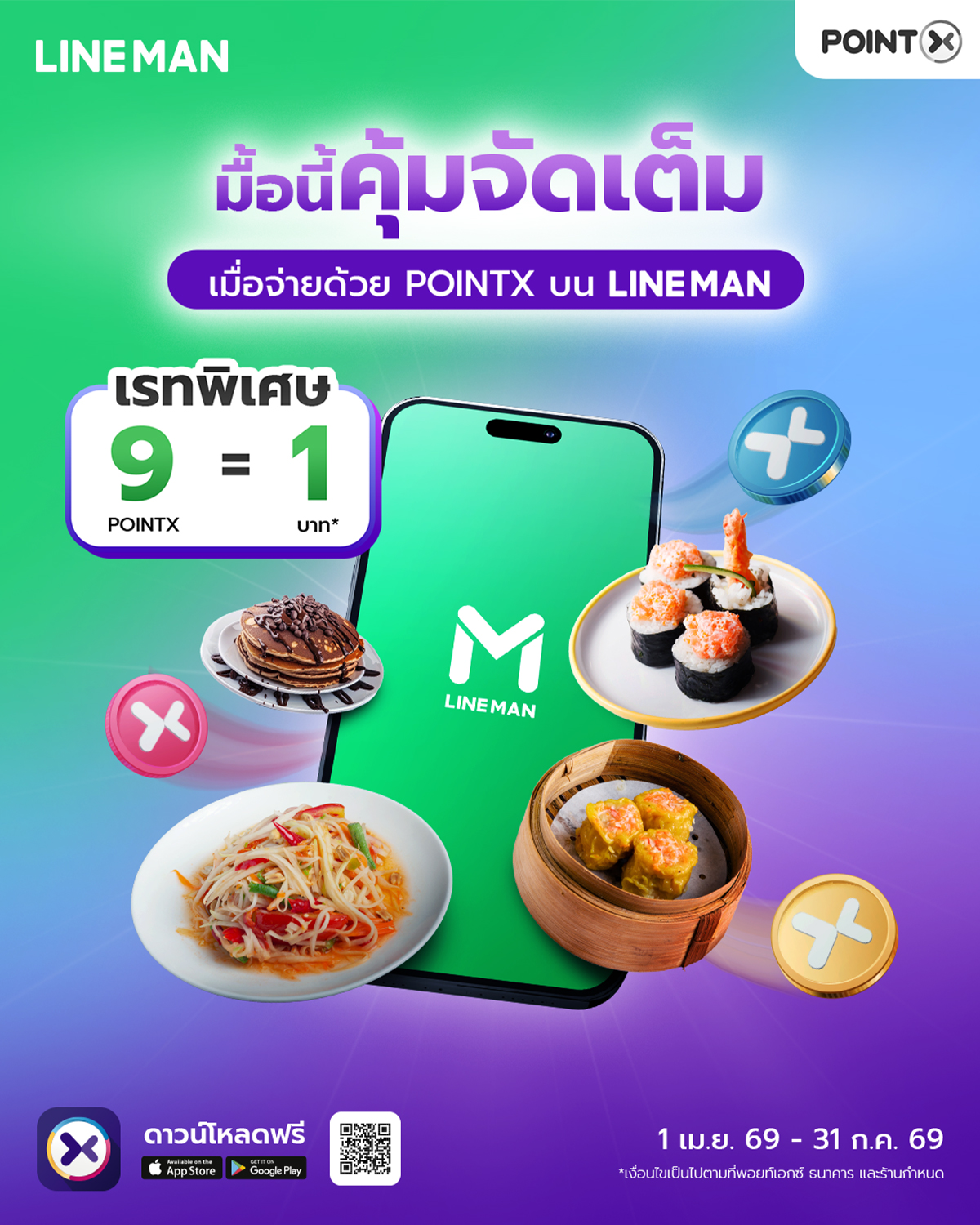 • สิทธิพิเศษนี้สำหรับลูกค้าบริษัท พอยท์เอกซ์ จำกัด (“พอยท์เอกซ์”) ที่ชำระค่าอาหารและเครื่องดื่มที่ LINE MAN Food (“ร้านค้า”) ด้วยคะแนน POINTX ผ่านช่องทางการชำระเงิน QR พร้อมเพย์ หรือ Mobile Banking บน SCB Easy Application รับสิทธิแลกคะแนน POINTX ด้วยอัตราแลกคะแนนพิเศษตามข้อกำหนดและเงื่อนไขของรายการส่งเสริมการขายที่กำหนดไว้นี้ ตั้งแต่วันที่ 1 เมษายน 2569 – 31 กรกฎาคม 2569 (“ระยะเวลาส่งเสริมการขาย”) เท่านั้น ทั้งนี้ ไม่รวมช่วงระยะเวลาที่ระบบขัดข้องหรือหยุดให้บริการชั่วคราวเพื่อปิดปรับปรุงระบบ