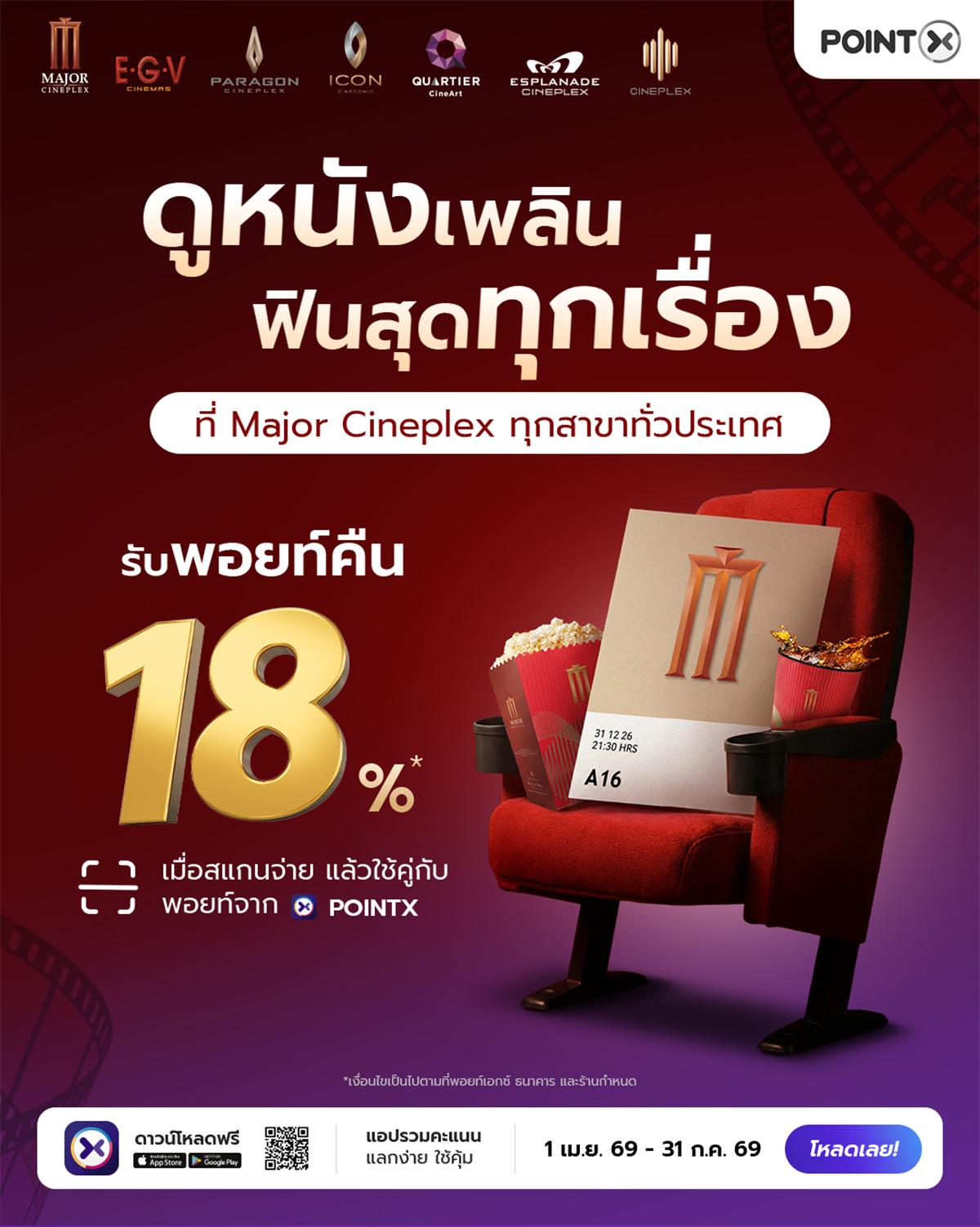 - สิทธิพิเศษนี้สำหรับลูกค้าบริษัท พอยท์เอกซ์ จำกัด (“พอยท์เอกซ์”) ที่เป็นสมาชิก POINTX Application รับคะแนนพิเศษ POINTX คืน 18% เมื่อชำระค่าบัตรชมภาพยนตร์ หรือค่าอาหารและเครื่องดื่มที่โรงภาพยนตร์ในเครือ เมเจอร์ ซีนีเพล็กซ์ ทุกสาขาทั่วประเทศ (“ร้านค้า”) ด้วยช่องทางชำระเงิน QR พร้อมเพย์ บน SCB Easy Application ตามข้อกำหนดและเงื่อนไขของรายการส่งเสริมการขายที่กำหนดไว้นี้ ตั้งแต่วันที่ 1 เมษายน 2569 – 31 กรกฎาคม 2569 (“ระยะเวลาส่งเสริมการขาย”) เท่านั้น ทั้งนี้ ไม่รวมช่วงระยะเวลาที่ระบบขัดข้องหรือหยุดให้บริการชั่วคราวเพื่อปิดปรับปรุงระบบ