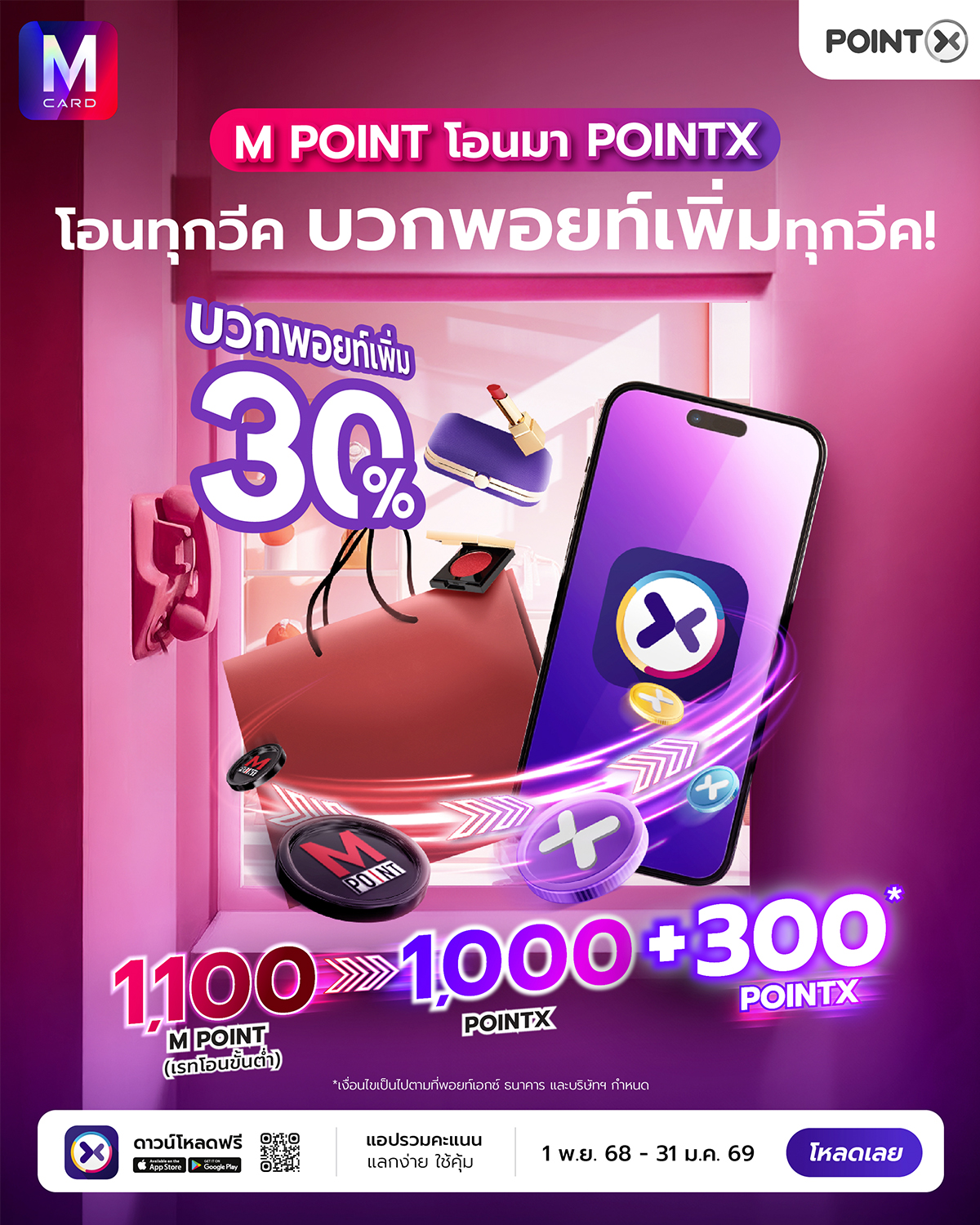 - สิทธิพิเศษนี้สำหรับลูกค้าสมาชิก M Card ที่มีคะแนน M Point และได้ทำการโอนคะแนน M Point มาเป็นคะแนน POINTX ในช่วงระยะเวลาส่งเสริมการขายคือตั้งแต่ วันที่ 1 พฤศจิกายน 2568 – 31 มกราคม 2568 หรือจนกว่าสิทธิจะหมด รับพอยท์พิเศษจาก POINTX เพิ่ม 30% ของคะแนน POINTX ที่โอนมา ดังนี้