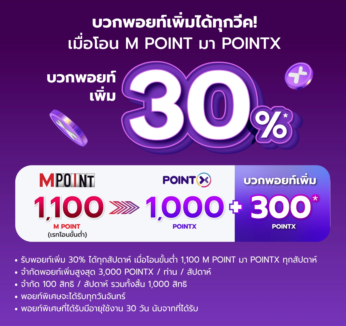 ลูกค้า POINTX รับพอยท์พิเศษเพิ่ม 30% ทุกสัปดาห์เมื่อโอนคะแนน M Point เป็น POINTX ทุกสัปดาห์ ขั้นต่ำ 1,100 M Point (= 1,000 POINTX)