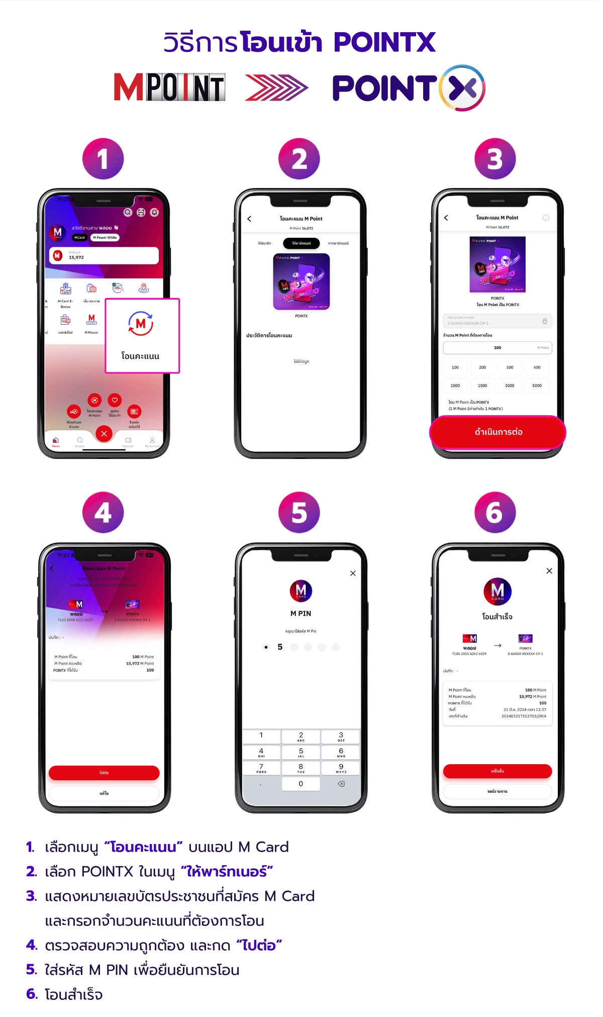 - ลูกค้าสามารถโอนคะแนน M Point เป็นคะแนน POINTX ผ่าน M Card Application ได้ตามเงื่อนไขการทำรายการที่บริษัท พอยท์เอกซ์ จำกัด (“พอยท์เอกซ์”) และบริษัท เดอะมอลล์ กรุ๊ป จำกัด กำหนด