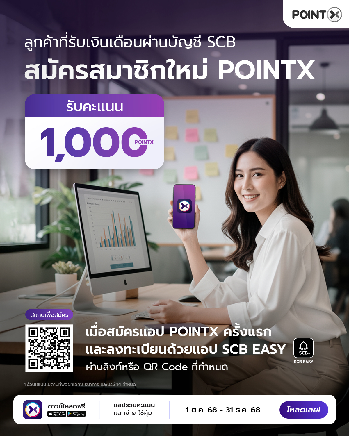 • สิทธิพิเศษนี้สำหรับลูกค้าบริษัท พอยท์เอกซ์ จำกัด (“พอยท์เอกซ์”) ที่ใช้บริการรับเงินเดือนผ่านบัญชี SCB (SCB Payroll) และได้ลงทะเบียนใช้งาน POINTX Application เป็นครั้งแรกผ่าน SCB EASY Application โดยการลงทะเบียนต้องทำผ่านลิงก์ หรือ QR Code ที่กำหนด ระหว่างวันที่ 1 ตุลาคม ถึง 31 ธันวาคม 2568