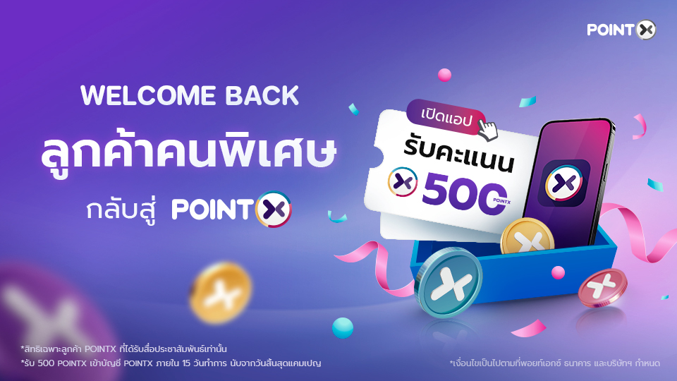 • ลูกค้าใหม่ หมายถึง ลูกค้าที่ไม่เคยลงทะเบียนใช้งาน POINTX Application มาก่อนช่วงเวลาแคมเปญ และไม่เคยได้รับสิทธิจากแคมเปญลักษณะเดียวกันมาก่อน รวมถึงกรณีที่ลูกค้าเคยมีบัญชี POINTX แต่ได้ยกเลิกบัญชีก่อนวันที่ 15 มีนาคม 2568