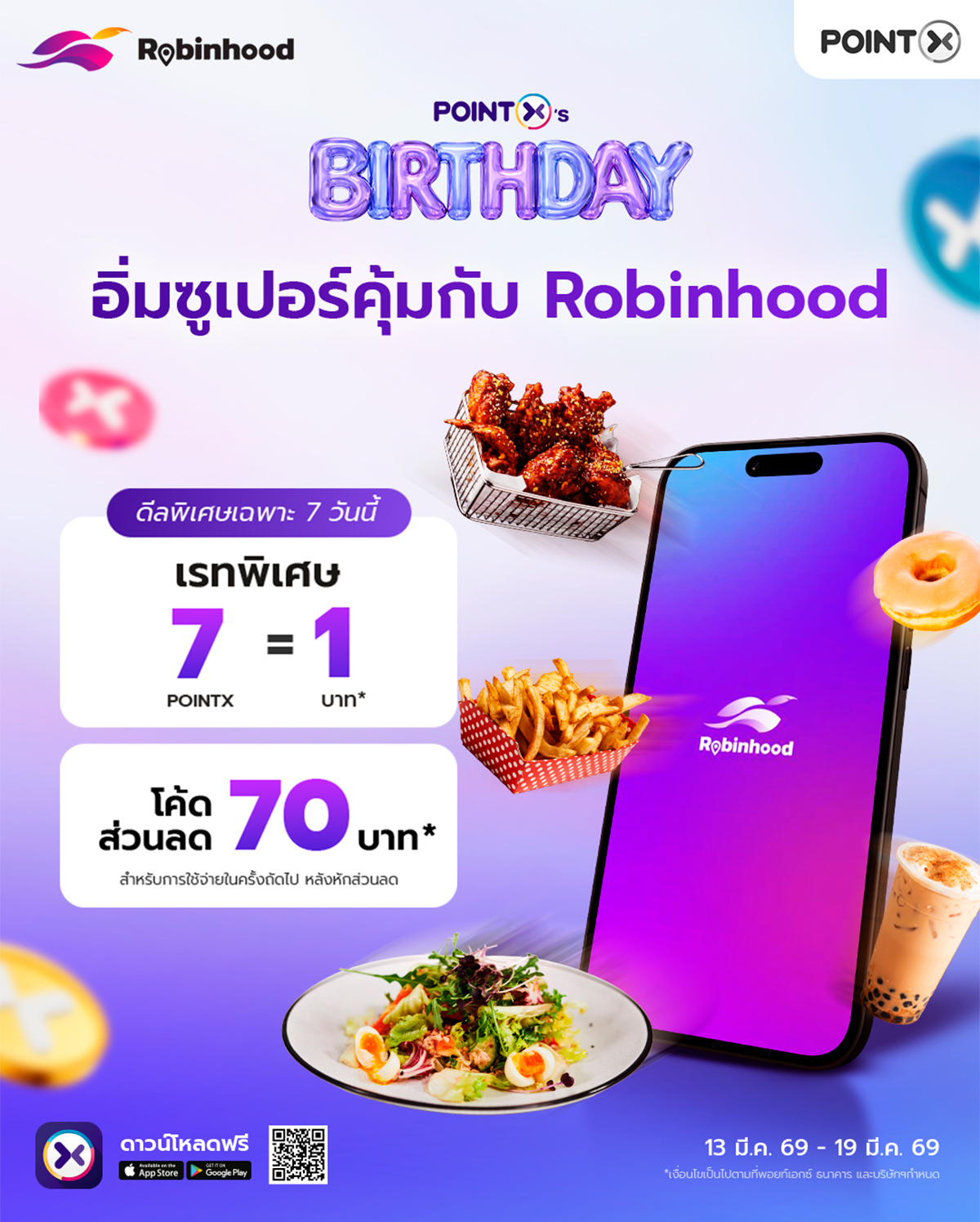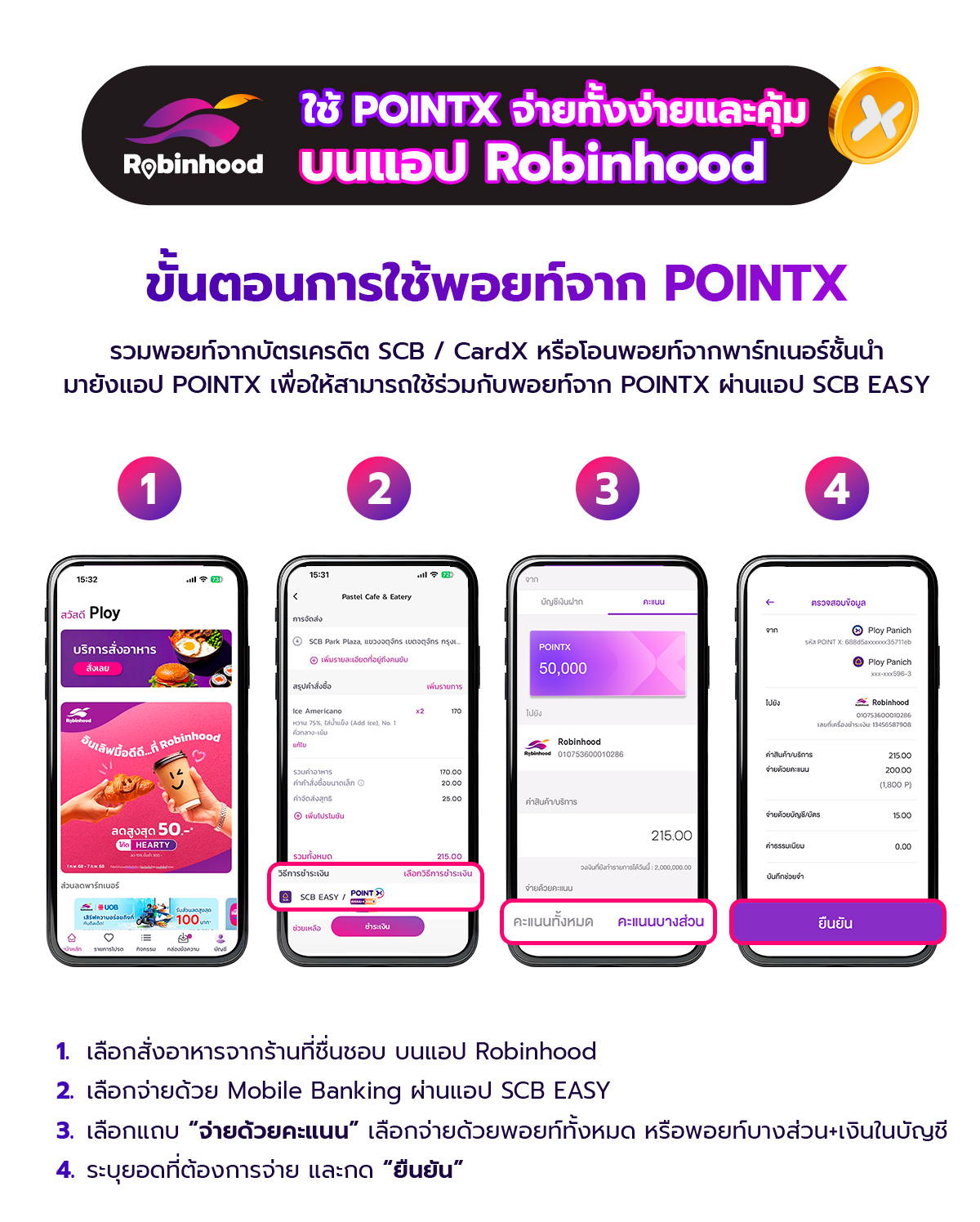 • สิทธิพิเศษนี้สำหรับลูกค้าบริษัท พอยท์เอกซ์ จำกัด (“พอยท์เอกซ์”) ที่เป็นสมาชิก POINTX Application ที่ใช้คะแนน POINTX เพื่อชำระค่าสินค้าและบริการกับร้านค้าบนแอปพลิเคชัน Robinhood โดยลูกค้าจะได้รับอัตราการแลกคะแนนพิเศษตามเงื่อนไขที่กำหนด เมื่อชำระค่าสินค้าและบริการกับร้านค้าที่ร่วมรายการ บนแอปพลิเคชัน Robinhood ผ่านช่องทางการชำระเงิน Mobile Banking บน SCB Easy Application ตั้งแต่วันที่ 13 – 19 มีนาคม 2569 (“ระยะเวลาส่งเสริมการขาย”)