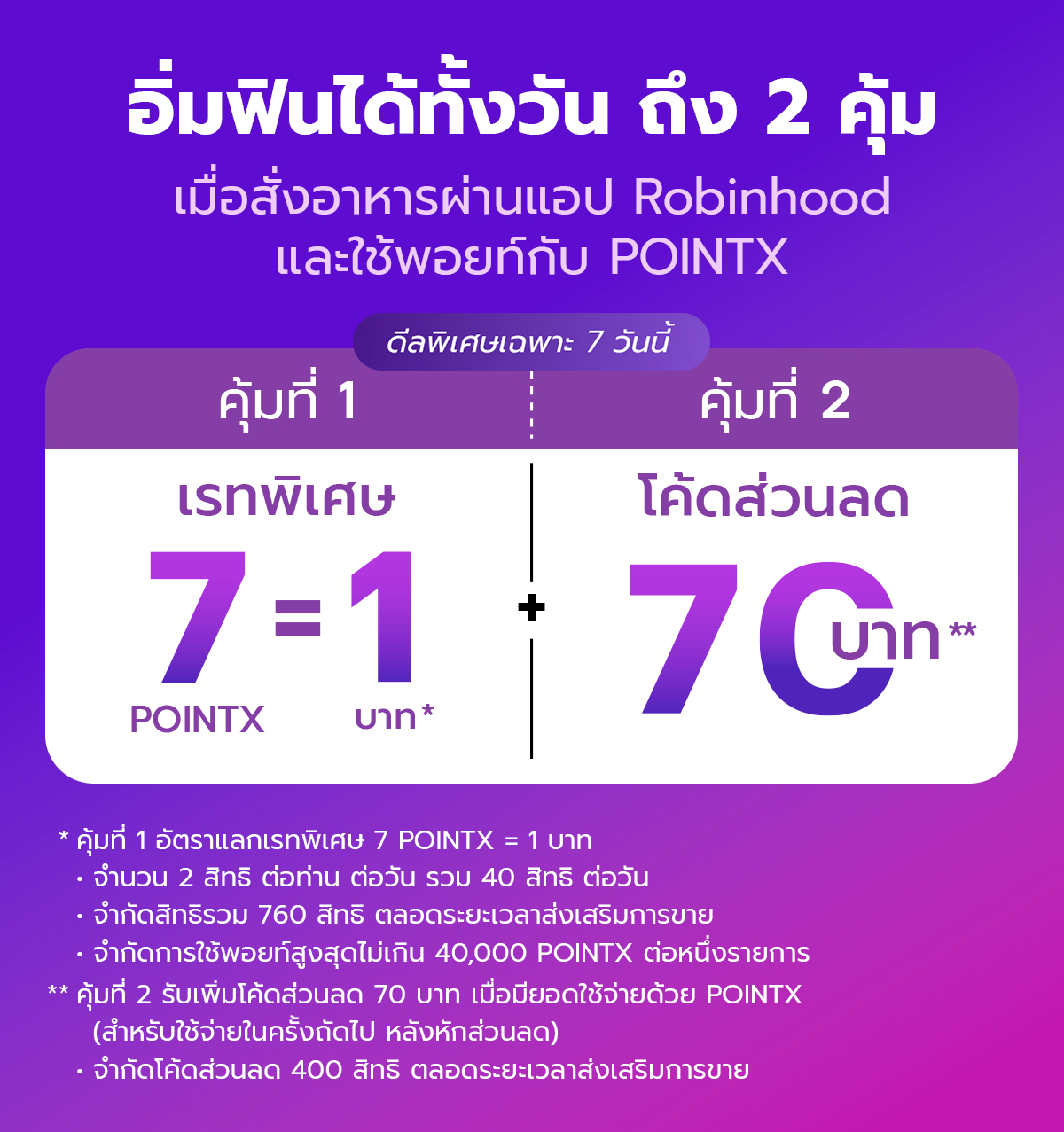 • จำกัดสิทธิการแลกคะแนนด้วยอัตราการแลกคะแนนพิเศษ เฉพาะลูกค้าที่ชำระค้าสินค้าและบริการด้วยคะแนน POINTX ที่แอปพลิเคชัน Robinhood จำนวน 2 สิทธิ ต่อท่าน ต่อวัน รวม 40 สิทธิ ต่อวัน จำกัดสิทธิรวม 760 สิทธิ ตลอดระยะเวลาส่งเสริมการขาย และขอสงวนสิทธิให้แก่ลูกค้าที่เข้าเงื่อนไขก่อนตามลำดับ