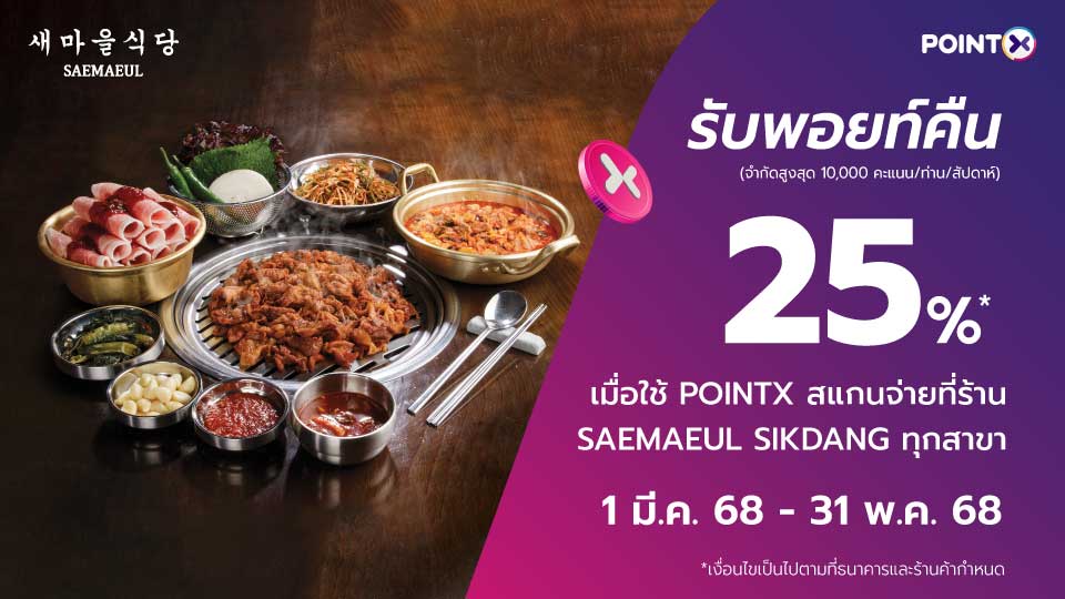 - สิทธิพิเศษนี้สำหรับลูกค้าบริษัท พอยท์เอกซ์ จำกัด (“พอยท์เอกซ์”) ที่เป็นสมาชิก POINTX Applicationรับพอยท์พิเศษ POINTX คืน 25% เมื่อชำระค่าอาหารหรือเครื่องดื่ม ด้วยคะแนน POINTX ที่ร้าน SAEMAEUL SIKDANG (“ร้านค้า”) ทุกสาขา ผ่านบริการช่องทางชำระเงินด้วย QR พร้อมเพย์ หรือ QR บัตรเครดิต บน SCB Easy Application ตามเงื่อนไขที่กำหนด ตั้งแต่วันที่ 1 มีนาคม 2568 – 31 พฤษภาคม 2568 เท่านั้น
