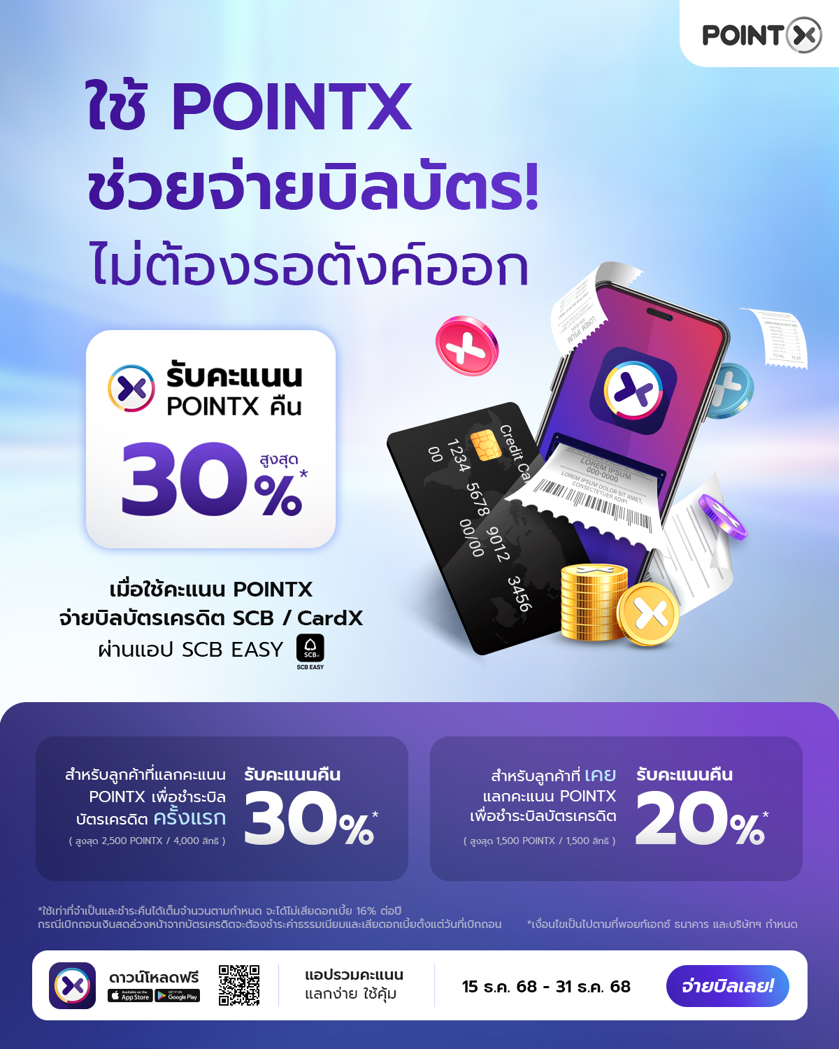 - ผู้ถือบัตรที่เป็นสมาชิก POINTX Application ตามเงื่อนไขรายการส่งเสริมการขายนี้ จะได้รับคะแนนพิเศษคืนสูงสุด 30% เมื่อใช้คะแนน POINTX ในการชำระบิลบัตรเครดิตผ่านบริการ SCB EASY Application ในระหว่างวันที่ 15-31 ธันวาคม 2568 เท่านั้น