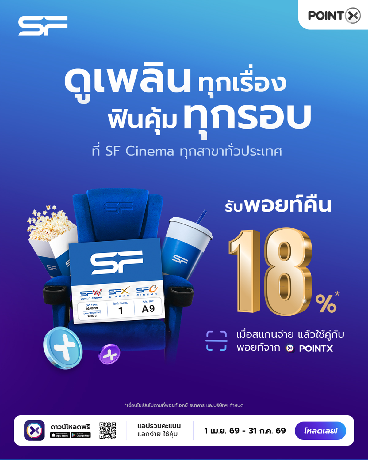 • สิทธิพิเศษนี้สำหรับลูกค้าบริษัท พอยท์เอกซ์ จำกัด (“พอยท์เอกซ์”) ที่เป็นสมาชิก POINTX Application รับคะแนนพิเศษ POINTX คืน 18% เมื่อชำระค่าบัตรชมภาพยนตร์ หรือค่าอาหารและเครื่องดื่มที่โรงภาพยนตร์ SF Cinema ทุกสาขาทั่วประเทศ (“ร้านค้า”) ด้วยช่องทางชำระเงิน QR พร้อมเพย์ บน SCB Easy Application ตามข้อกำหนดและเงื่อนไขของรายการส่งเสริมการขายที่กำหนดไว้นี้ ตั้งแต่วันที่ 1 เมษายน 2569 – 31 กรกฎาคม 2569 (“ระยะเวลาส่งเสริมการขาย”) เท่านั้น ทั้งนี้ ไม่รวมช่วงระยะเวลาที่ระบบขัดข้องหรือหยุดให้บริการชั่วคราวเพื่อปิดปรับปรุงระบบ