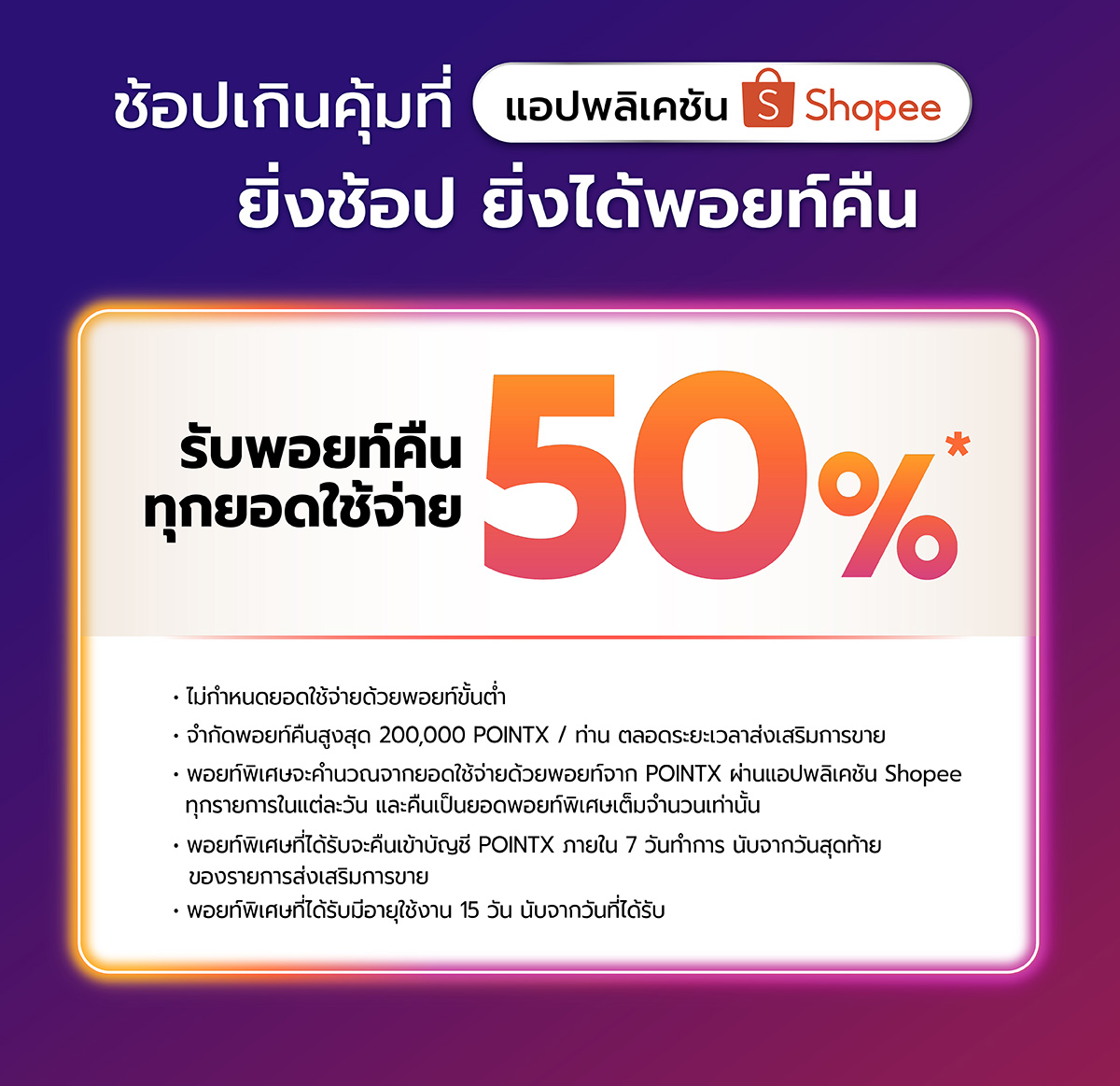 - รับคะแนนพิเศษคืน 50% เมื่อลูกค้าชำระค่าสินค้าหรือบริการ ด้วย POINTX บนแอปพลิเคชัน Shopee