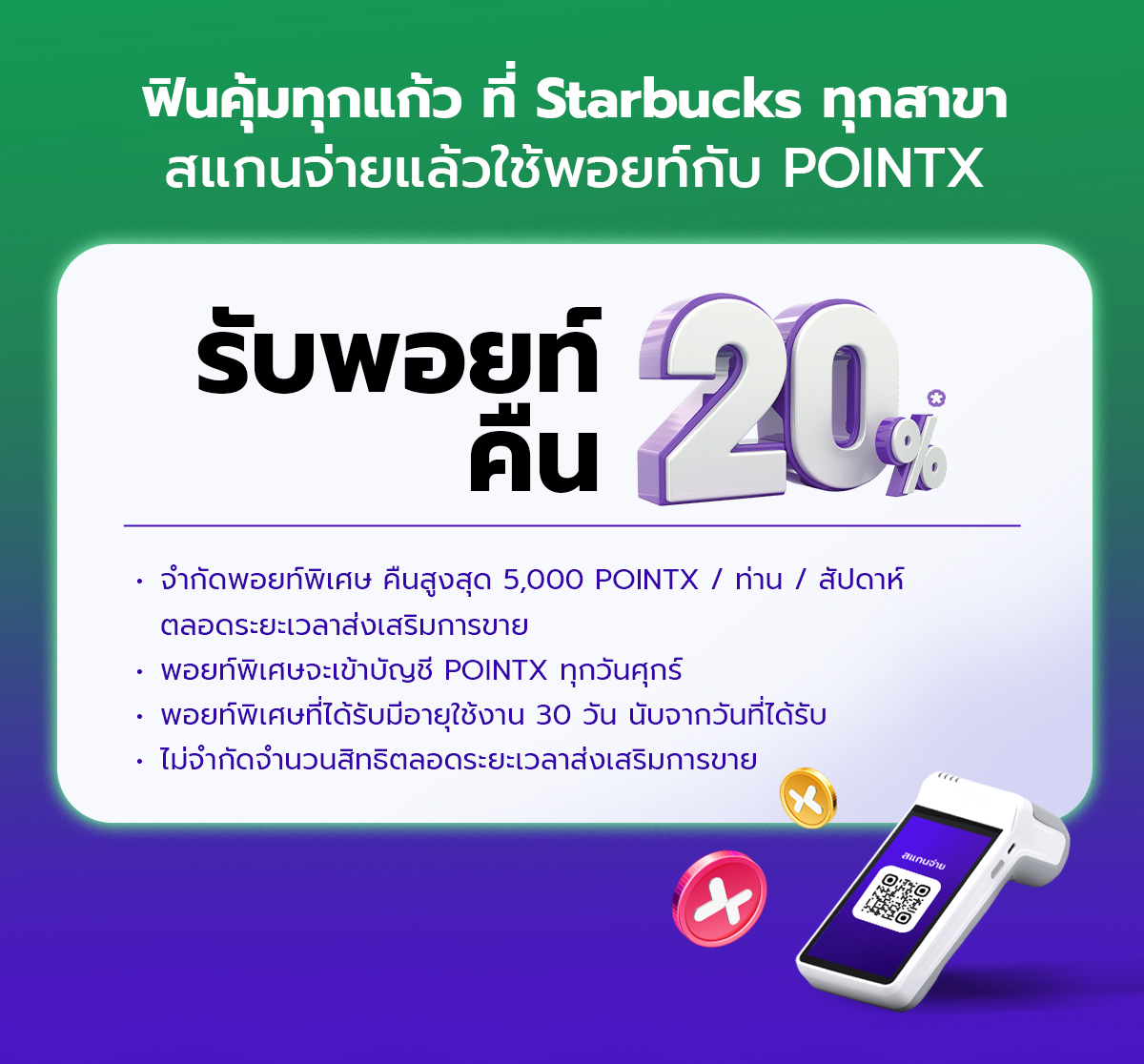 - สิทธิพิเศษนี้สำหรับลูกค้าบริษัท พอยท์เอกซ์ จำกัด (“พอยท์เอกซ์”) ที่เป็นสมาชิก POINTX Application รับพอยท์พิเศษ POINTX คืน 20% เมื่อชำระค่าอาหารหรือเครื่องดื่มด้วยคะแนน POINTX ที่ร้าน Starbucks (“ร้านค้า”) ทุกสาขา ด้วยช่องทางชำระเงิน QR พร้อมเพย์ บน SCB Easy Application ตามข้อกำหนดและเงื่อนไขของรายการส่งเสริมการขายที่กำหนดไว้นี้ ตั้งแต่วันที่ 1 มกราคม 2569 – 30 เมษายน 2569 (“ระยะเวลาส่งเสริมการขาย”) เท่านั้น ทั้งนี้ ไม่รวมช่วงระยะเวลาที่ระบบขัดข้องหรือหยุดให้บริการชั่วคราวเพื่อปิดปรับปรุงระบบ