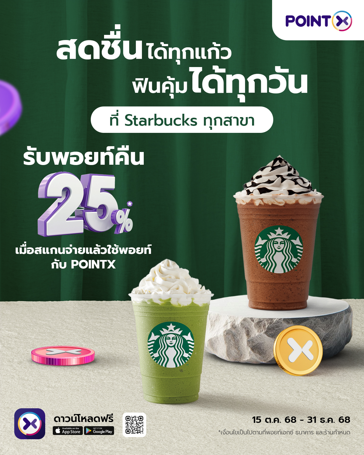 - รับพอยท์คืน 25% เมื่อสแกนจ่ายด้วยคะแนน POINTX ผ่าน QR พร้อมเพย์ ที่ร้าน Starbucks ทุกสาขา