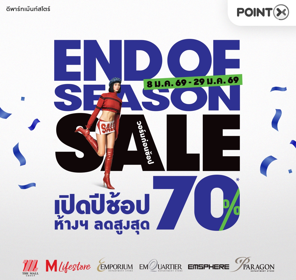 - สิทธิพิเศษนี้สำหรับลูกค้าบริษัท พอยท์เอกซ์ จำกัด (“พอยท์เอกซ์”) ที่เป็นสมาชิก POINTX Application รับคะแนนพิเศษตามเงื่อนไขที่กำหนด เมื่อชำระค่าสินค้าด้วยคะแนน POINTX ที่ห้างสรรพสินค้าเดอะมอลล์ไลฟ์สโตร์ และเดอะมอลล์ ทุกสาขา, เอ็มโพเรียม, เอ็มควอเทียร์, เอ็มสเฟียร์ และพารากอน(“เดอะมอลล์ กรุ๊ป”) ซึ่งรวมถึง Gourmet Market, และ PowerMall ด้วยช่องทางชำระเงิน QR พร้อมเพย์ ผ่านบัญชีเงินฝากธนาคารไทยพาณิชย์ บน SCB Easy Application ภายในระยะเวลาส่งเสริมการขายของแคมเปญ End of Season Sale ระหว่างวันที่ 8 มกราคม 2569 – 29 มกราคม 2569 (“ระยะเวลาแคมเปญ”) เท่านั้น ทั้งนี้ ไม่รวมช่วงระยะเวลาที่หยุดให้บริการชั่วคราวเพื่อปิดปรับปรุงระบบหรือระบบขัดข้อง