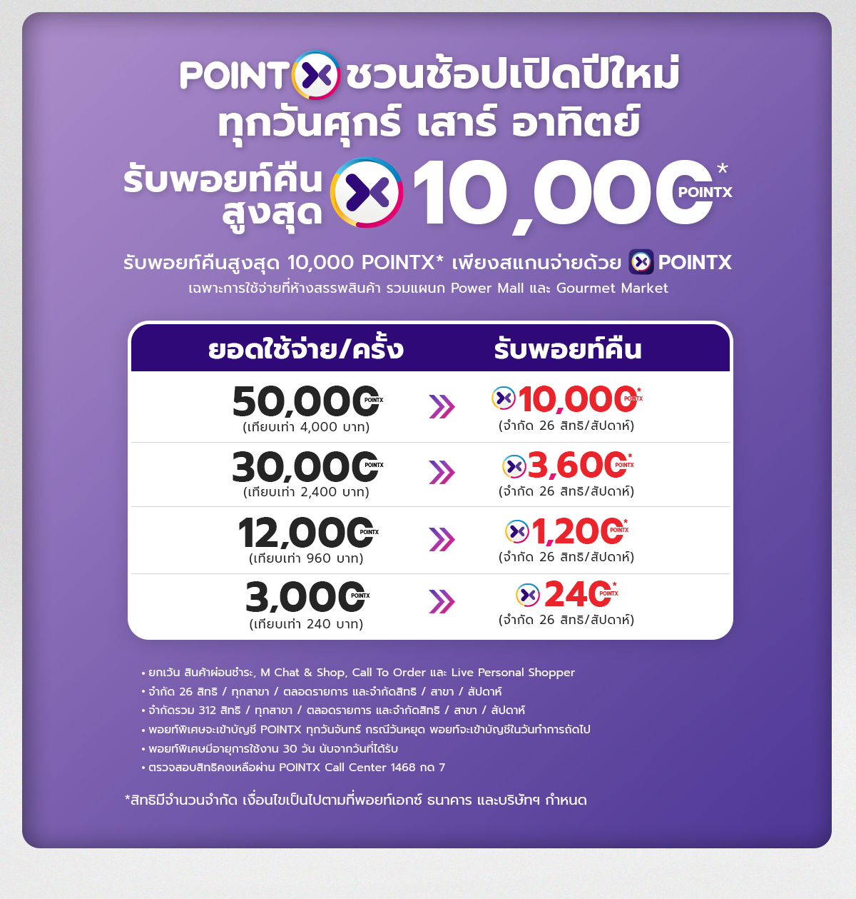 - รับคะแนนพิเศษ 10,000 POINTX เมื่อใช้จ่าย 50,000 POINTX ต่อครั้ง ต่อสัปดาห์
