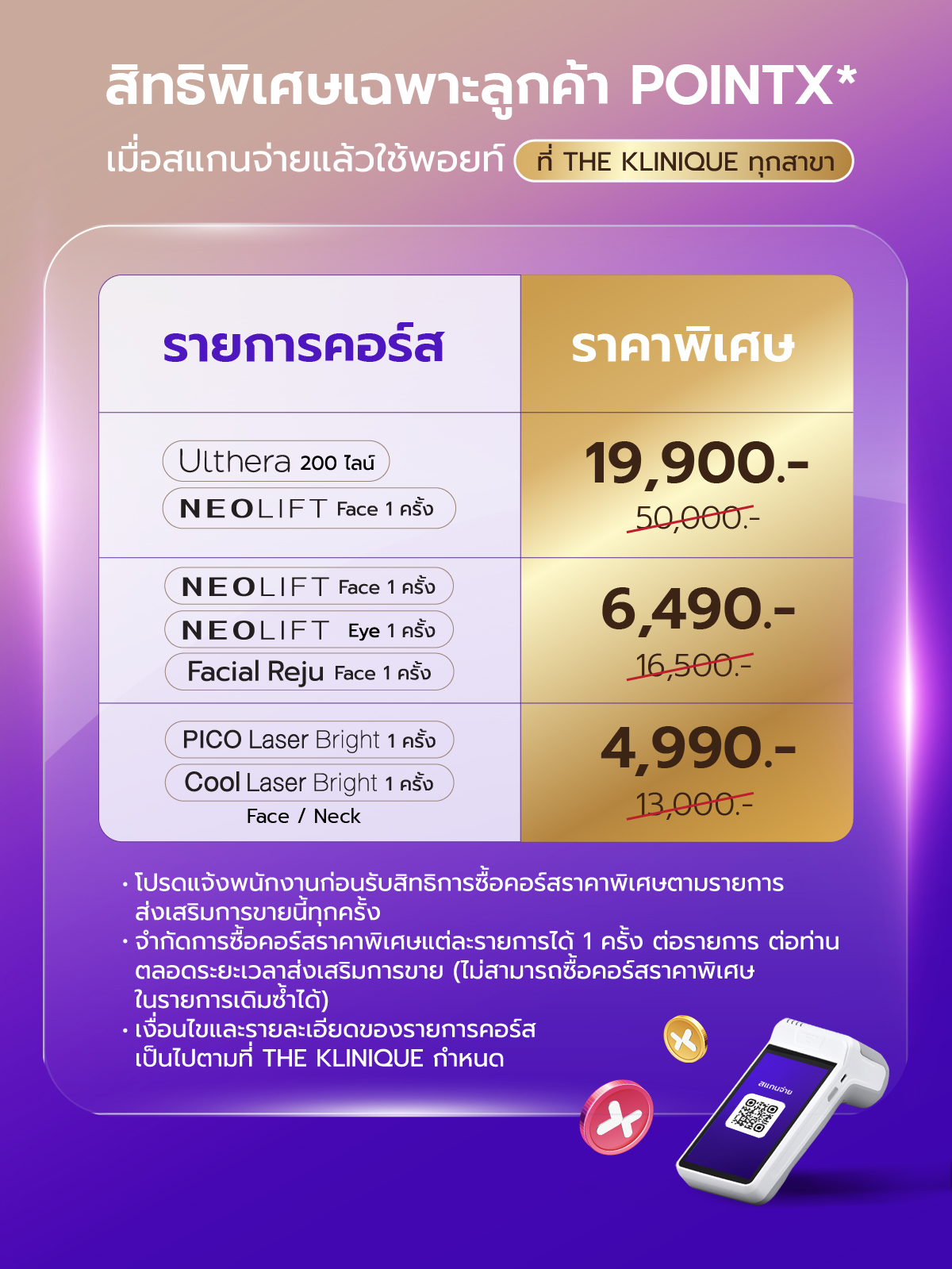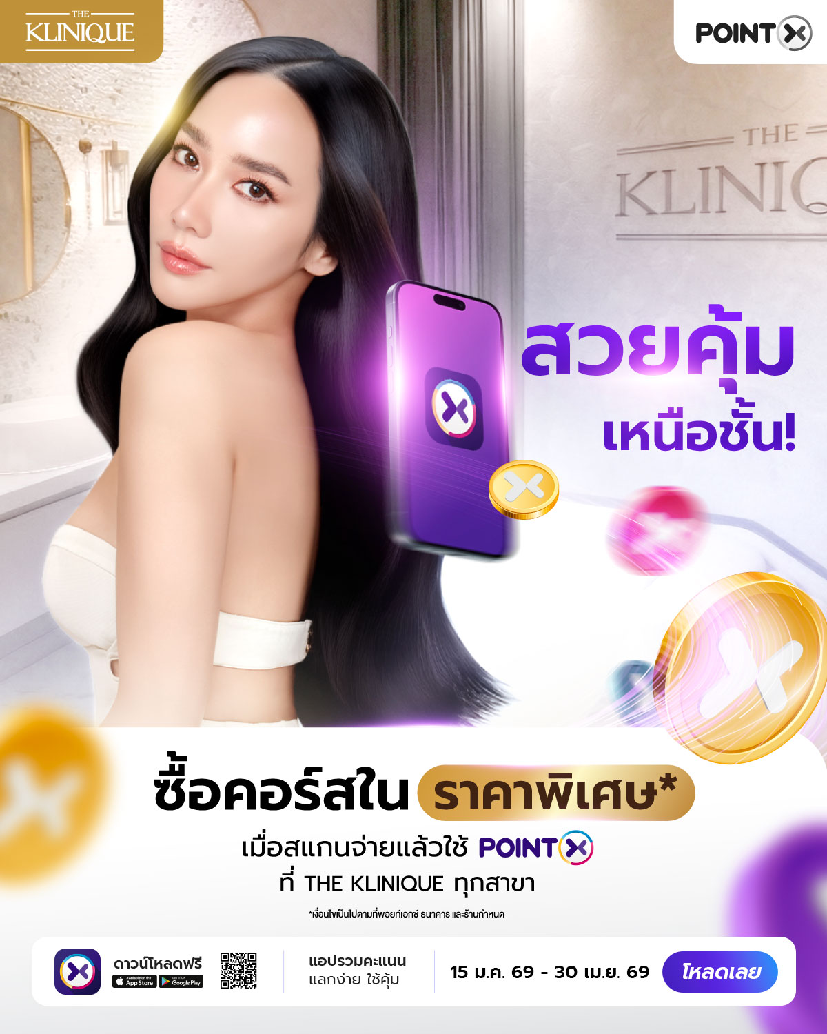 - สิทธิพิเศษนี้สำหรับลูกค้าบริษัท พอยท์เอกซ์ จำกัด (“บริษัท”) ที่เป็นสมาชิก POINTX Application รับสิทธิซื้อคอร์สราคาพิเศษ The Klinique (“ร้านค้า”) ทุกสาขา โดยเลือกชำระด้วยคะแนน POINTX เต็มจำนวน หรือ คะแนน POINTX บางส่วน + เงินในบัญชีเงินฝาก SCB ด้วยช่องทางชำระเงิน QR พร้อมเพย์ ผ่านบริการ SCB Easy Application ตามข้อกำหนดและเงื่อนไขของรายการส่งเสริมการขายที่กำหนดไว้นี้ ตั้งแต่วันที่ 15 มกราคม 2569 – 30 เมษายน 2569 เท่านั้น