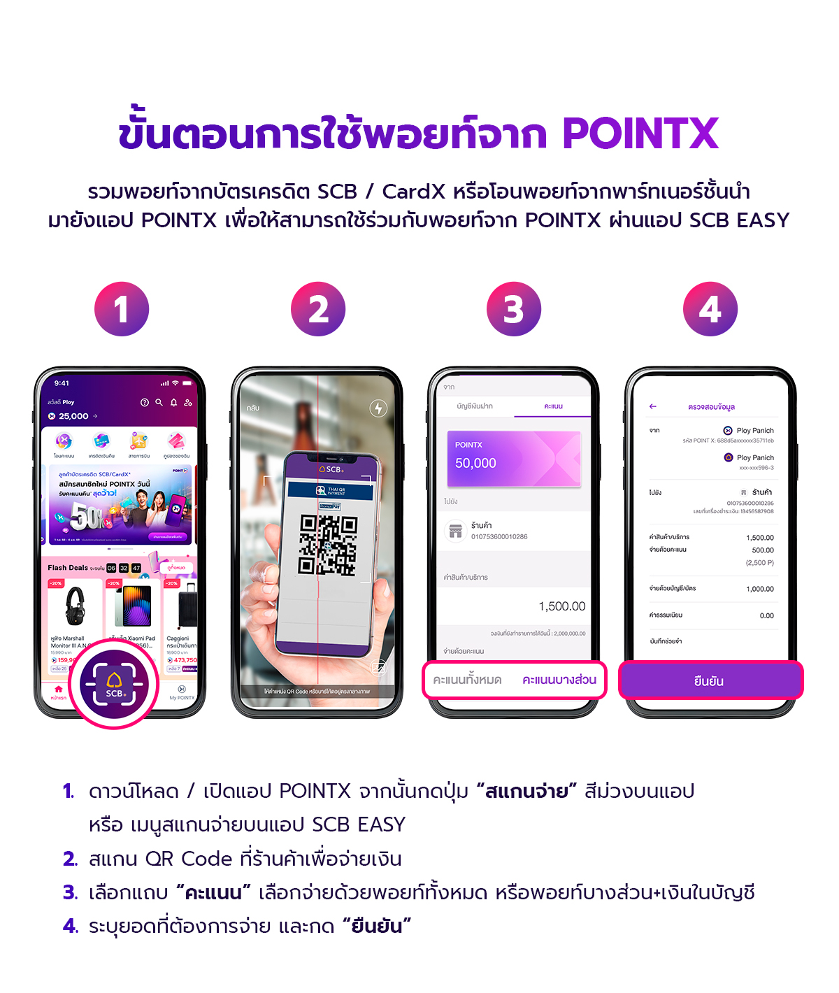 - สามารถสแกนจ่ายด้วยคะแนน POINTX เต็มจำนวน หรือ คะแนน POINTX บางส่วน + เงินในบัญชีเงินฝาก SCB ผ่านบริการ SCB Easy Application